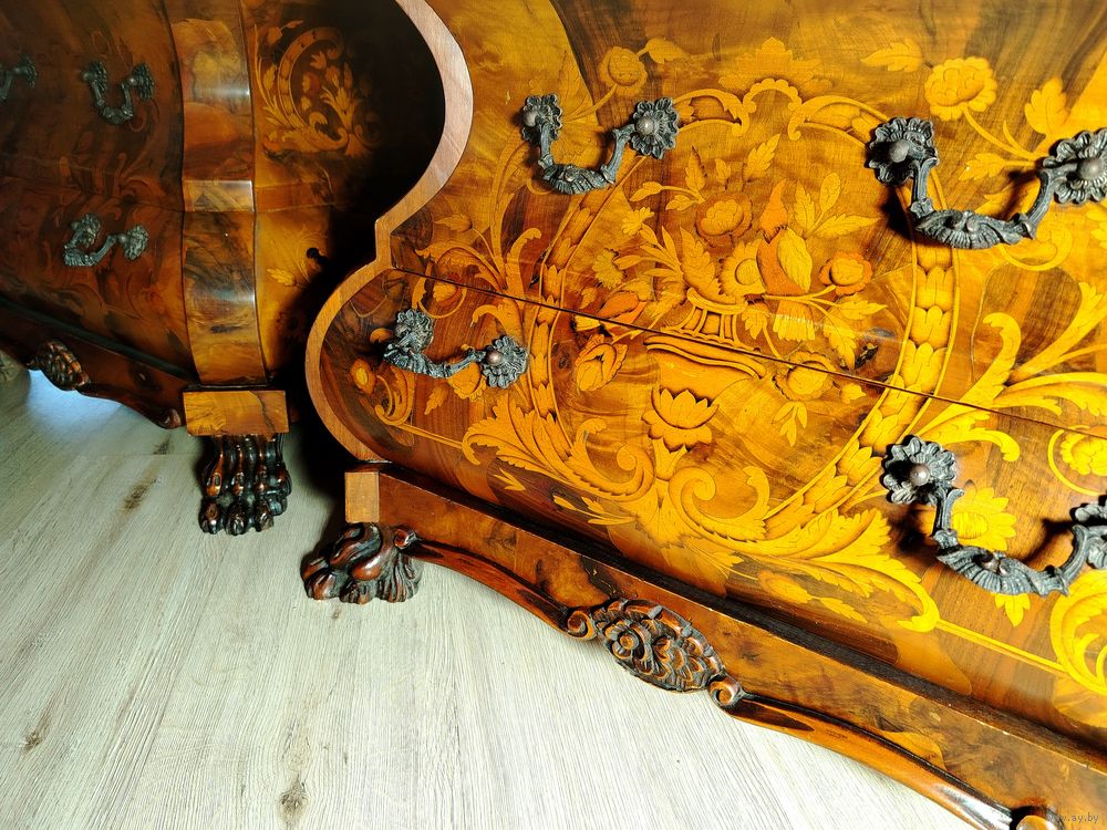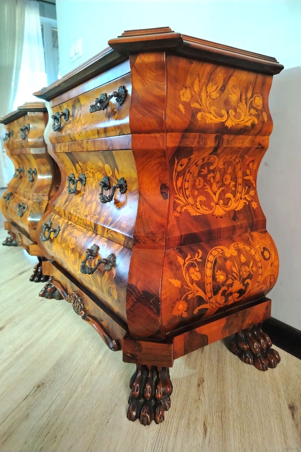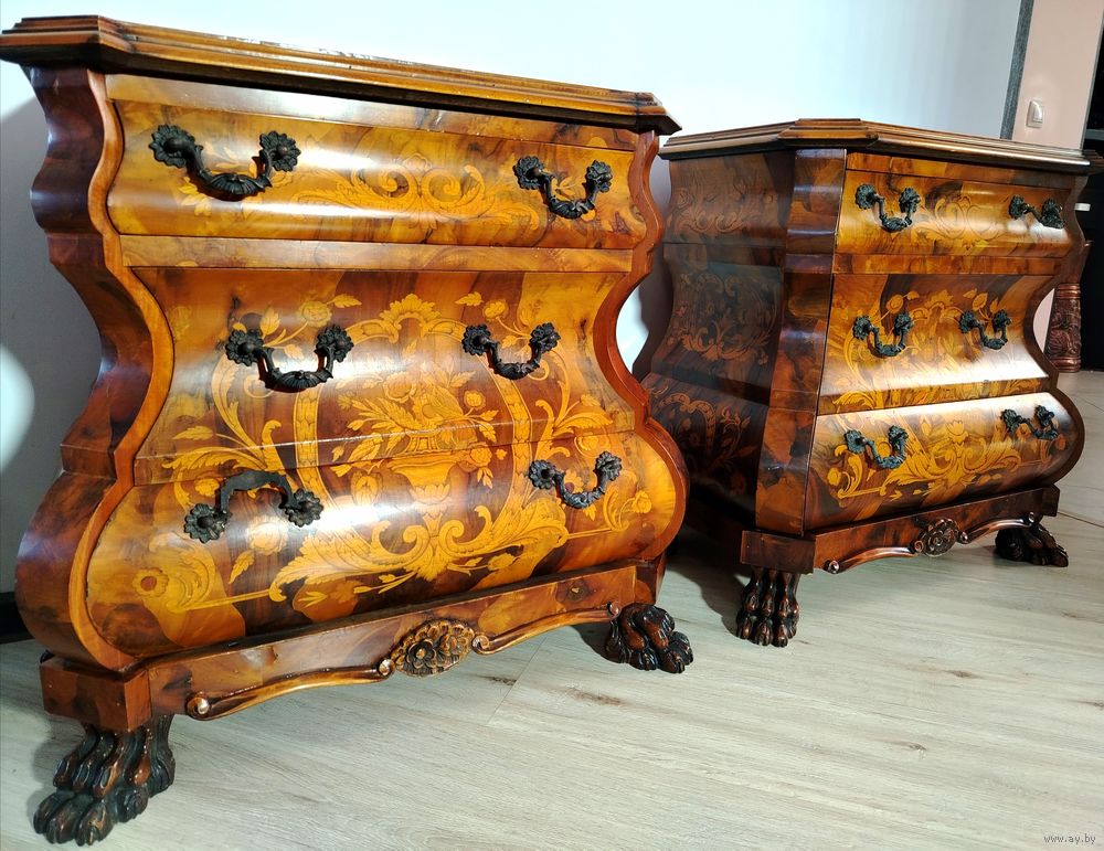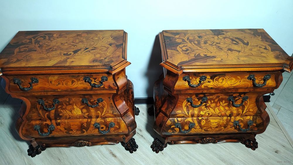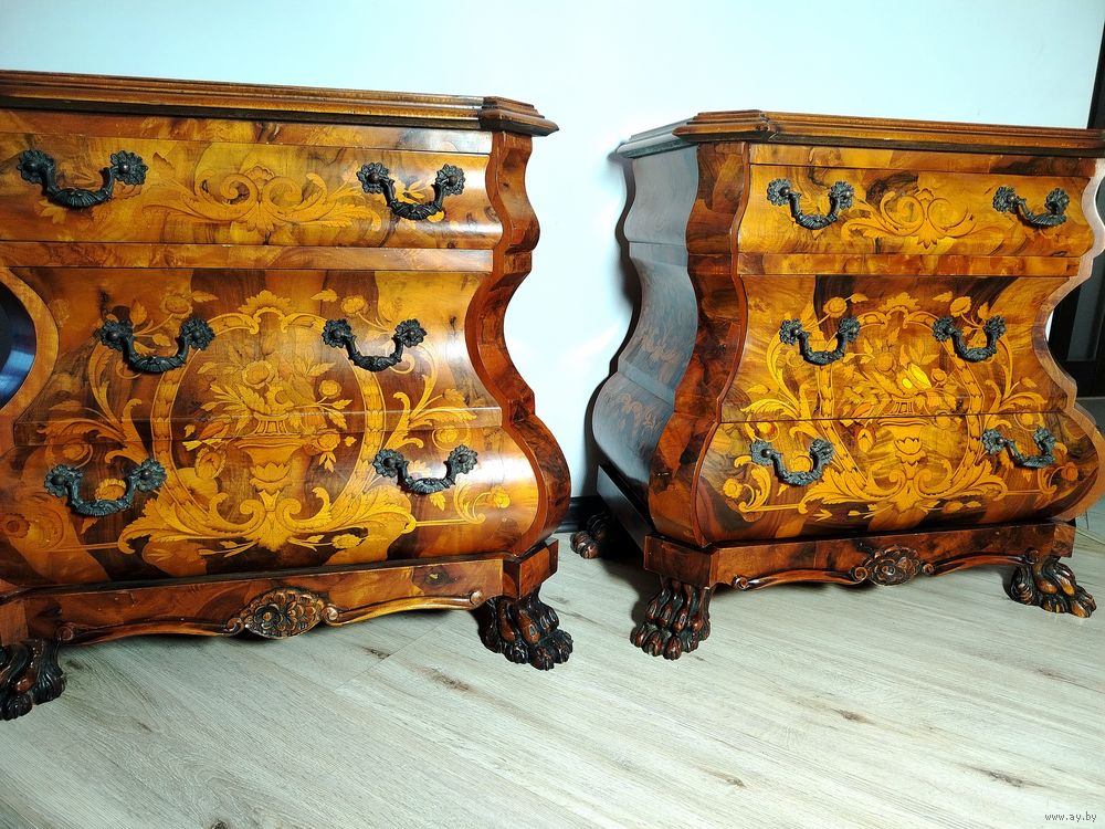 Пара комодиков интересной формы. Европа. Массив дерева, техника маркетри. Высота 62см ширина 62см глубина 35 см.