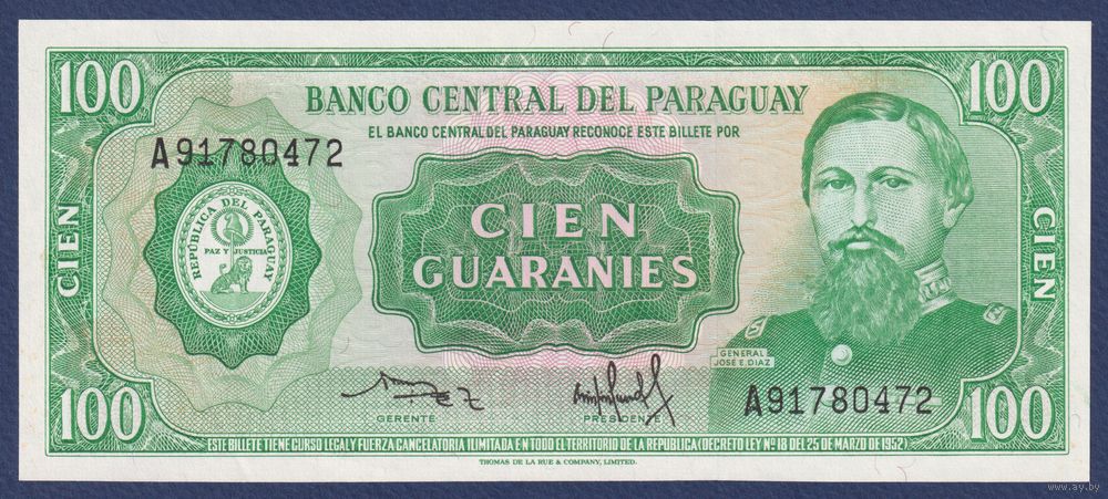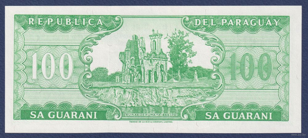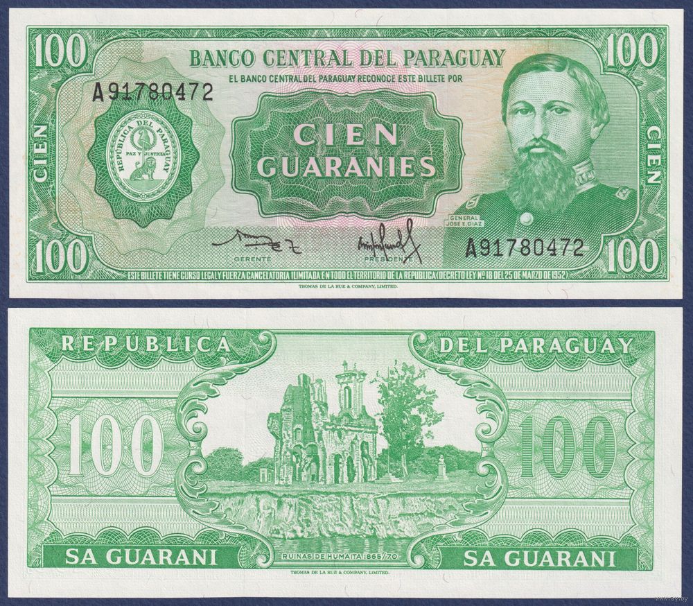 Парагвай, 100 гуарани 1952 (1982) г., P-205(3) (A, генерал Хоче Диас, Руины Хумаиты), UNC