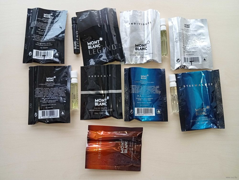 Есть 5 ароматов: LEGEND (1,2мл), PRESENCE (2мл), INDIVIDUEL (2мл), STARWALKER (2мл) и EXCEPTIONEL (2мл).