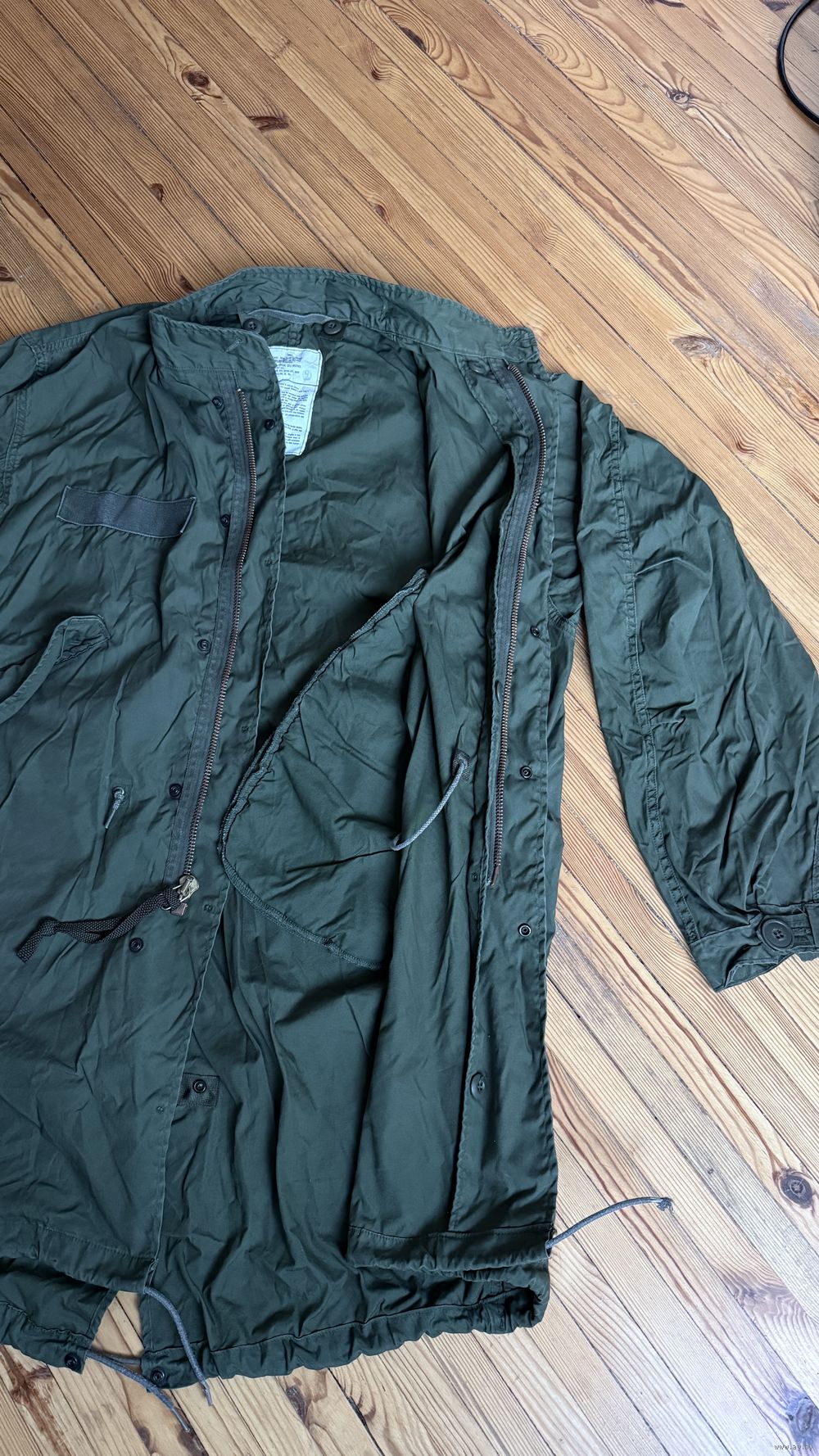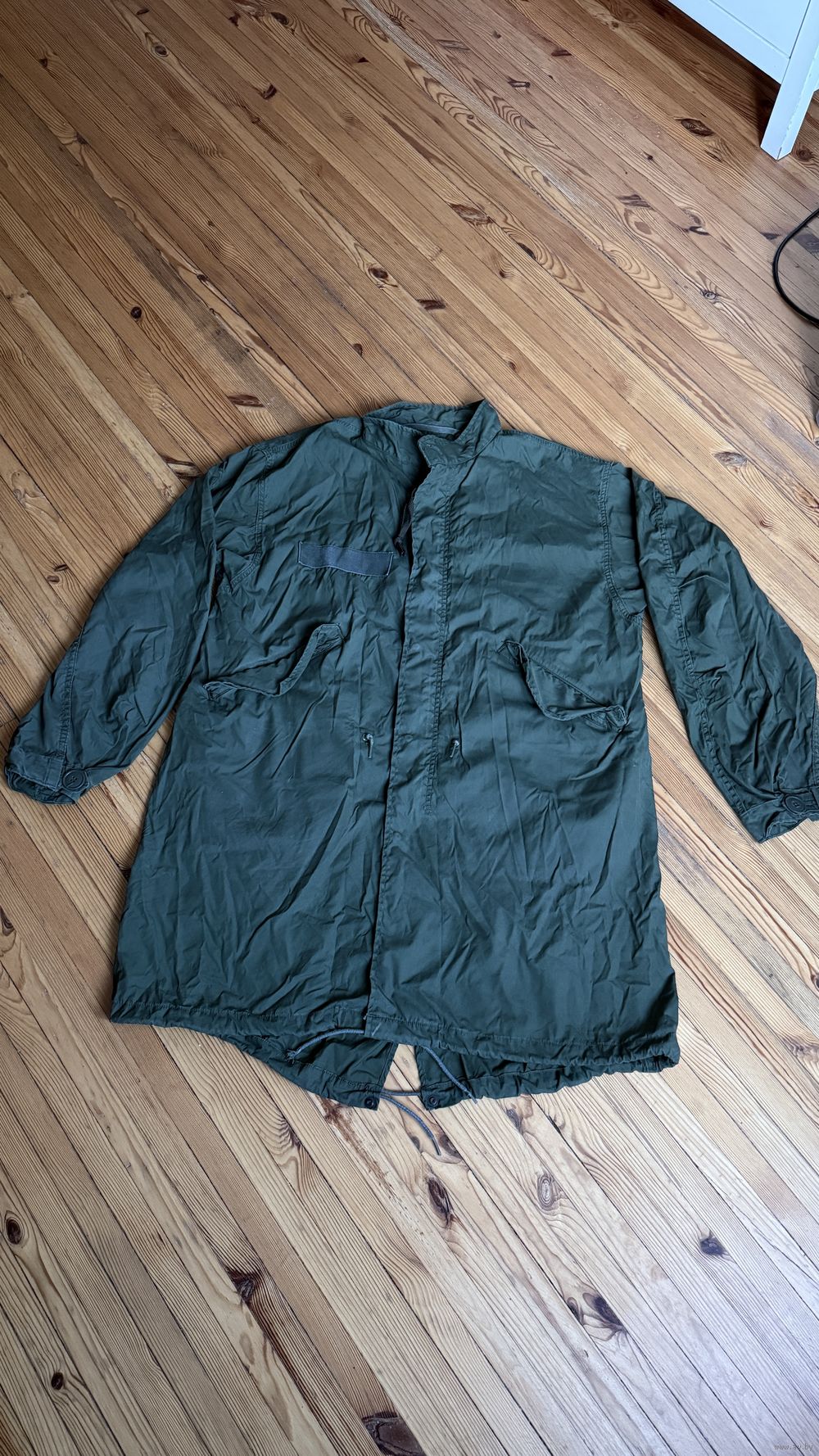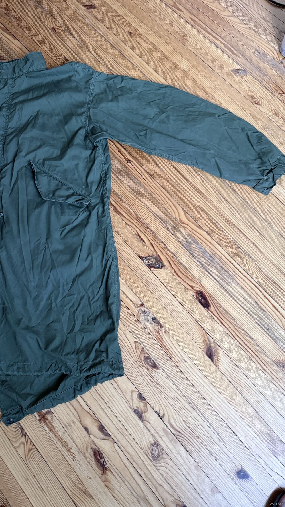 В отличном состоянии за исключением пары пятен. Без подстега. Замок и кнопки работаю исправно. Карманы утеплены.