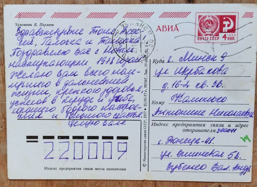 Пармеев Б. С Новым Годом! 1977 г. ПК. Прошла почту.