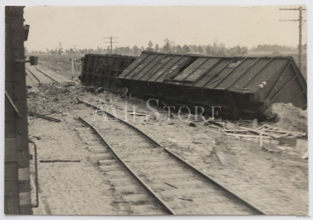 Подорванные партизанской миной рельсы и уничтоженные вагоны, спущенного под откос немецкого поезда на участке между БССР и РСФСР, в тылу группы армий "Центр". На одном из вагонов видна эмблема Красного креста. Фото одного из подразделений 45-й пехотной дивизии. 45-я пехотная дивизия летом 1941 года штурмовала Брестскую крепость, а позже участвовала в наступлении на Москву, где понесла тяжелые потери. Достаточно редкий сюжет фотографии - видны последствия действий партизан и партизанской войны. Смотрите другие фотографии этой серии. Размер около 5,9 см. х 7,8 см..