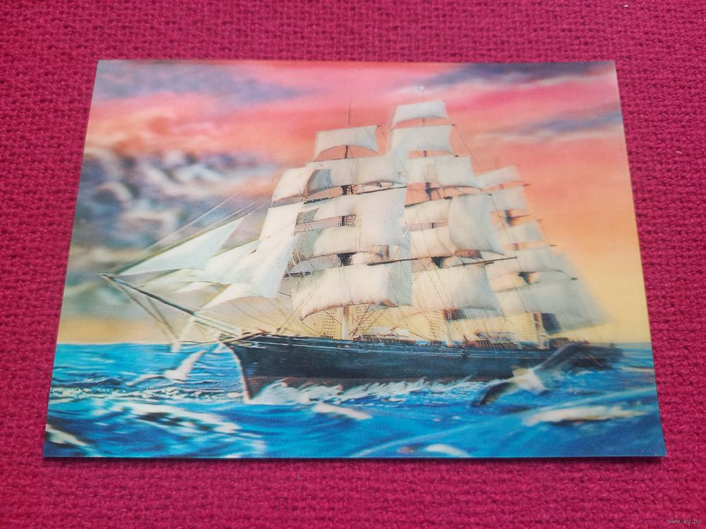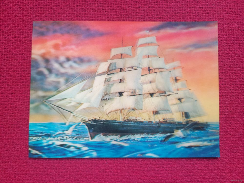 Парусник, корабль. Стерео открытка. Япония. Чистая.