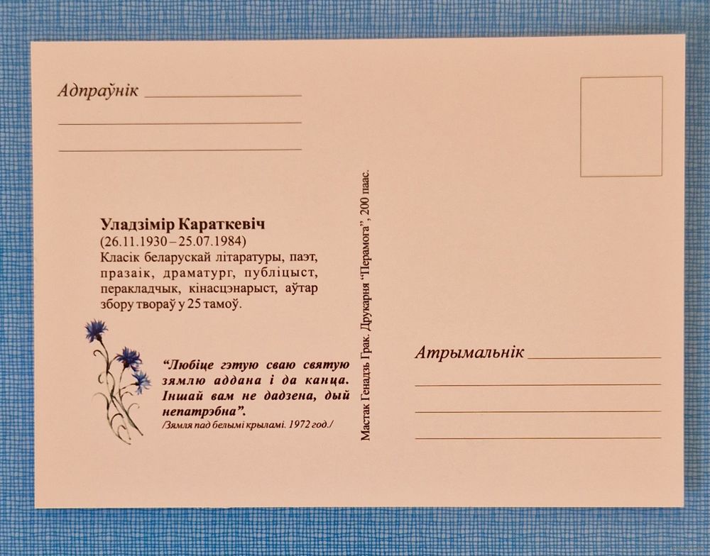 На адваротным баку паштоўкі надрукаваны афарызм Уладзіміра Караткевіча з кнігі "Зямля пад белымі крыламі" (1972 год).