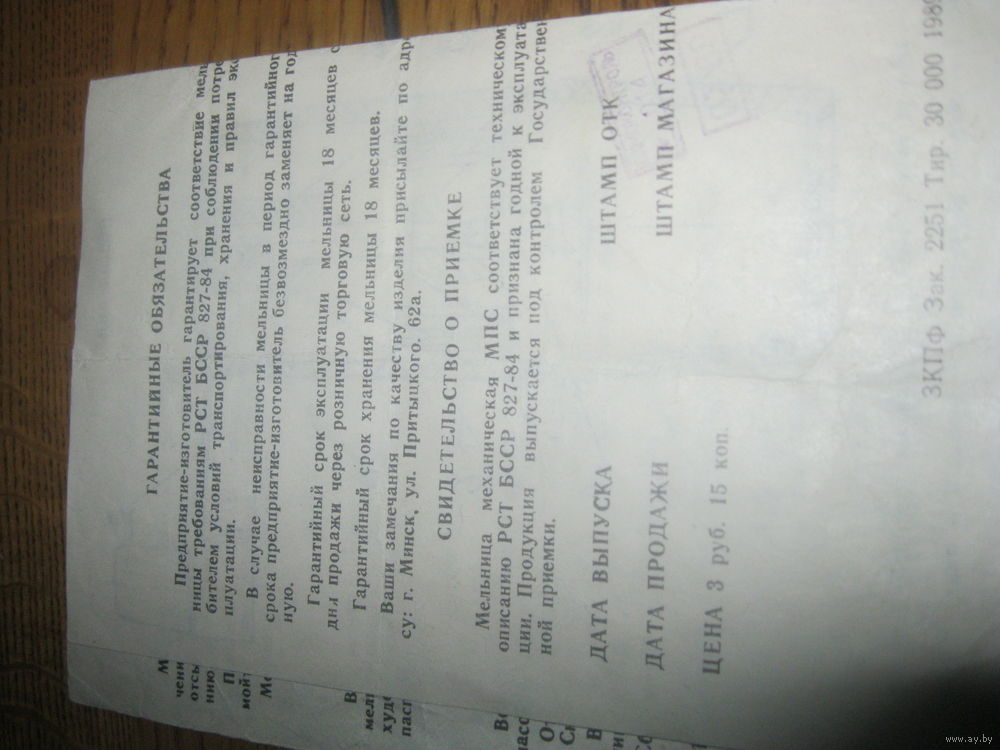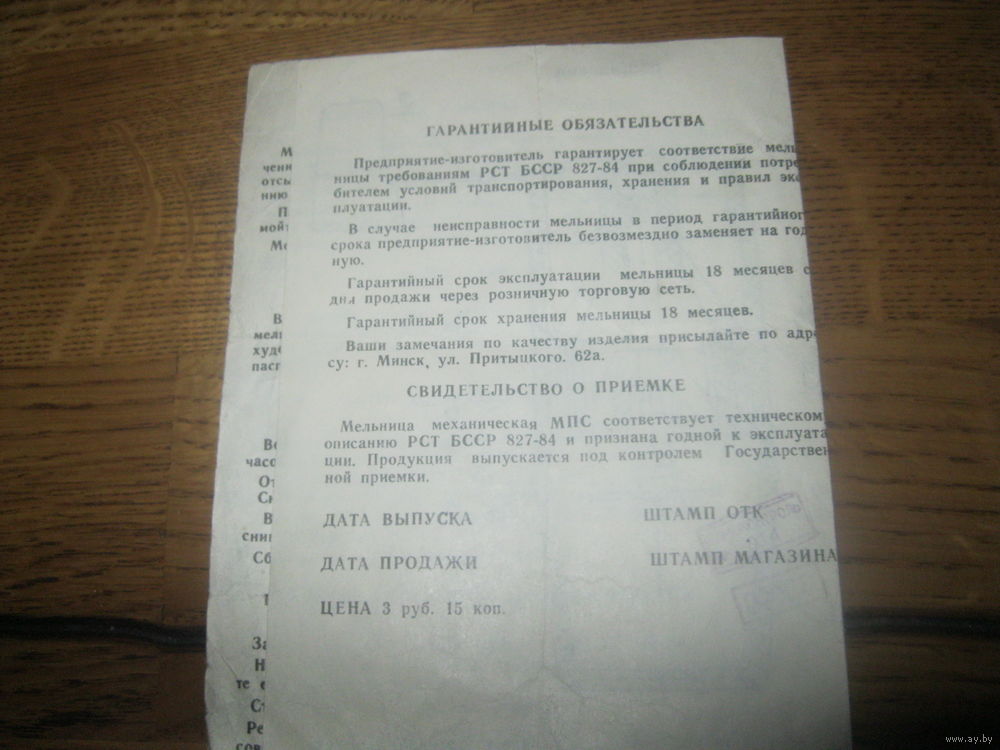 Паспорт мельница механическая МПС 1989 г. в норм.сост. без торга и обмена.ПОЧТАМИ НЕ ОТПРАВЛЯЮ ВООБЩЕ.Только самовывоз в будние дни г.Минск ул.П.Панченко !!!!!