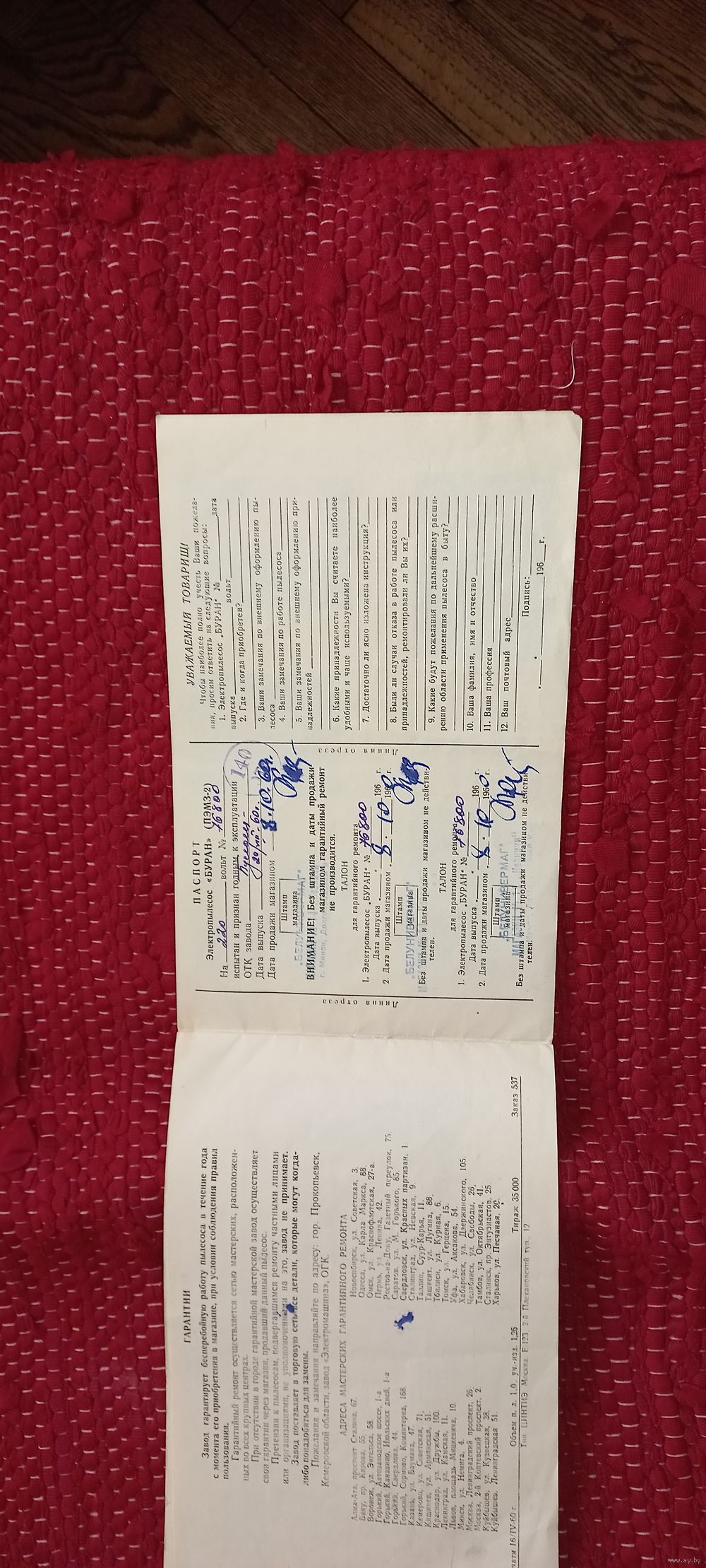 Паспорт ПЫлесос БУРАН 1960(Дшк)
