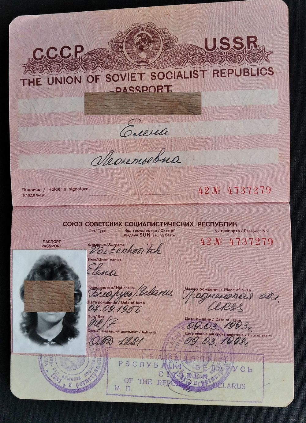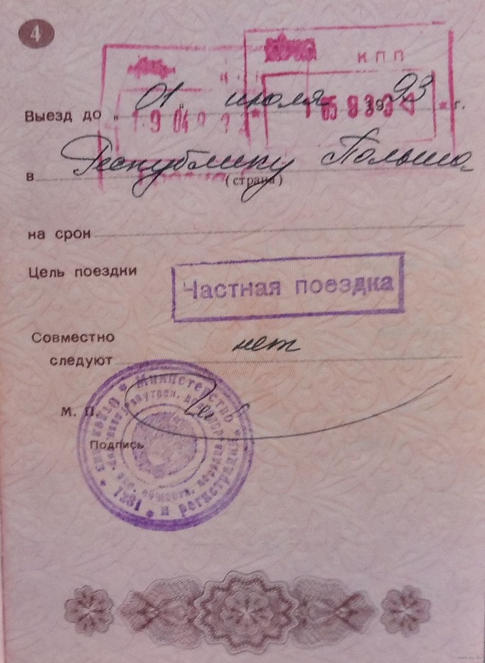 Паспорт СССР. Использовался в РБ. Разрешение на выезд в Польшу. Начало 1990-х.