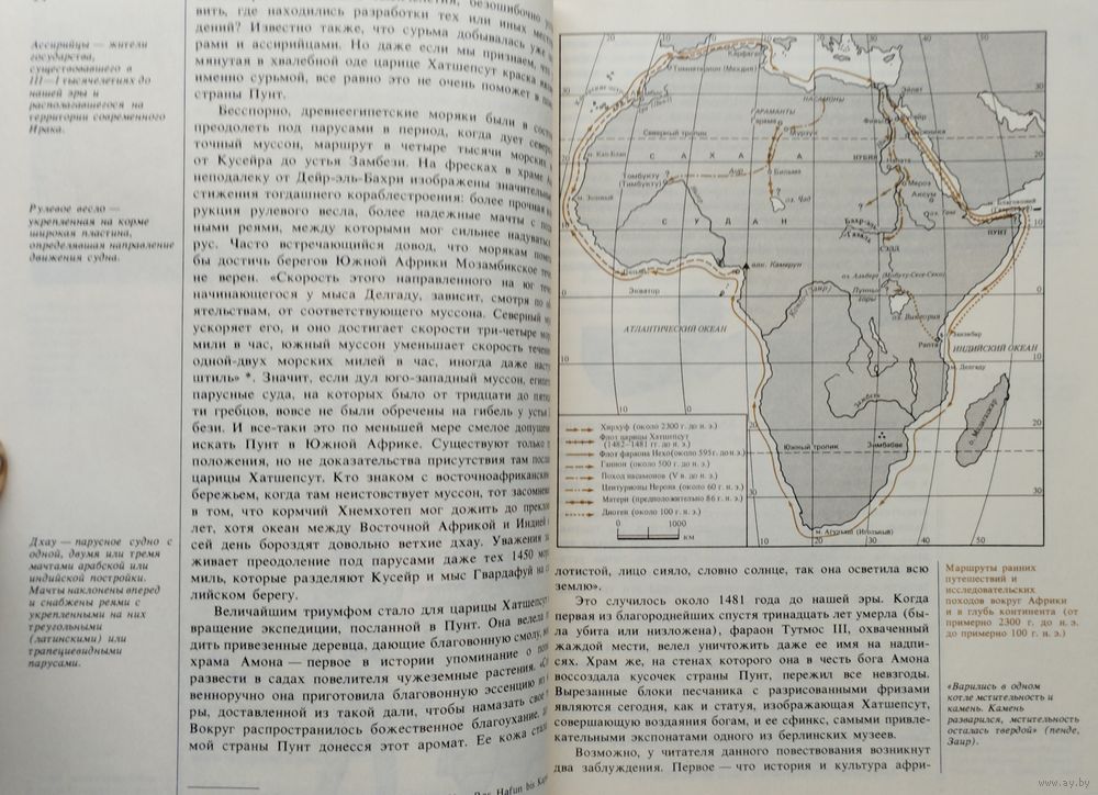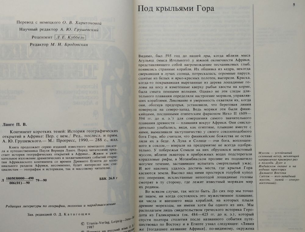 Большой энциклопедический формат. Тираж 50000 экз. 288 стр. История географических открытий в Африке со времен Древнего Египта до колониального раздела. Книга продолжает серию изданий известного немецкого писателя и путешественника Пауля Вернера Ланге. Иллюстрирована многочисленными ч/б гравюрами, схемами и картами. Хронологическая таблица. Список литературы. Указатель имен. Указаитель географических названий.
