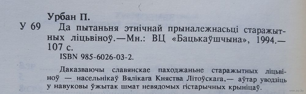 Паўла Урбан. Да пытаньня этнічнай прыналежнасьці старажытных ліцьвіноў. Мінск: Бацькаушчына: Бесядзь, 1994 г.. 107 с. Мяккая вокладка.