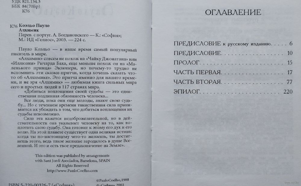 Цена за 1 книгу. 234 стр. «Алхимик» — роман авторства Пауло Коэльо, изданный в 1988 году и ставший мировым бестселлером. Издан более чем в 117 странах мира, переведён на 81 язык, в том числе на High Valyrian. Основной сюжет взят из европейского фольклора: по классификации фольклорных сюжетов Аарне-Томпсона-Утера — сюжет 1645 «Сокровище дома».