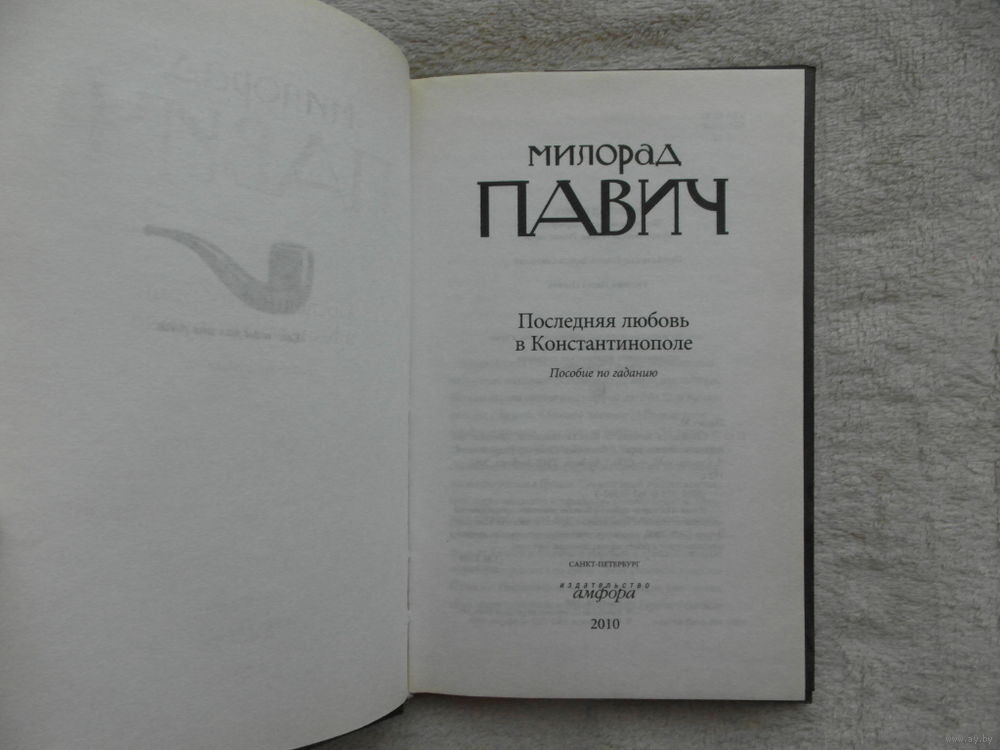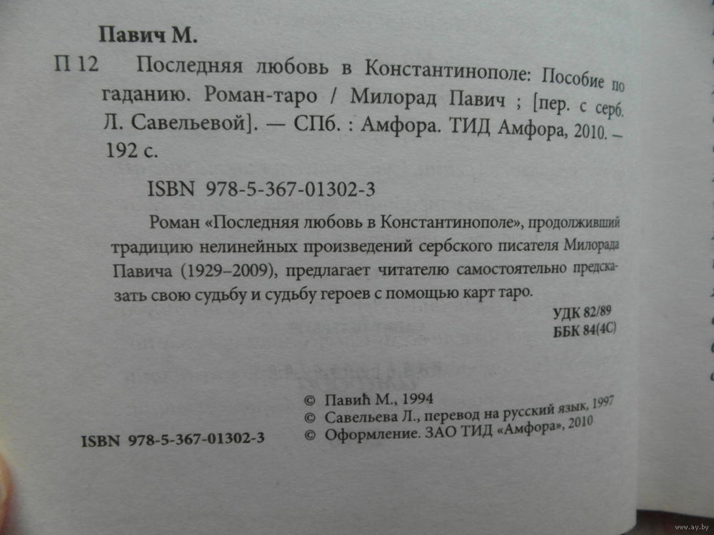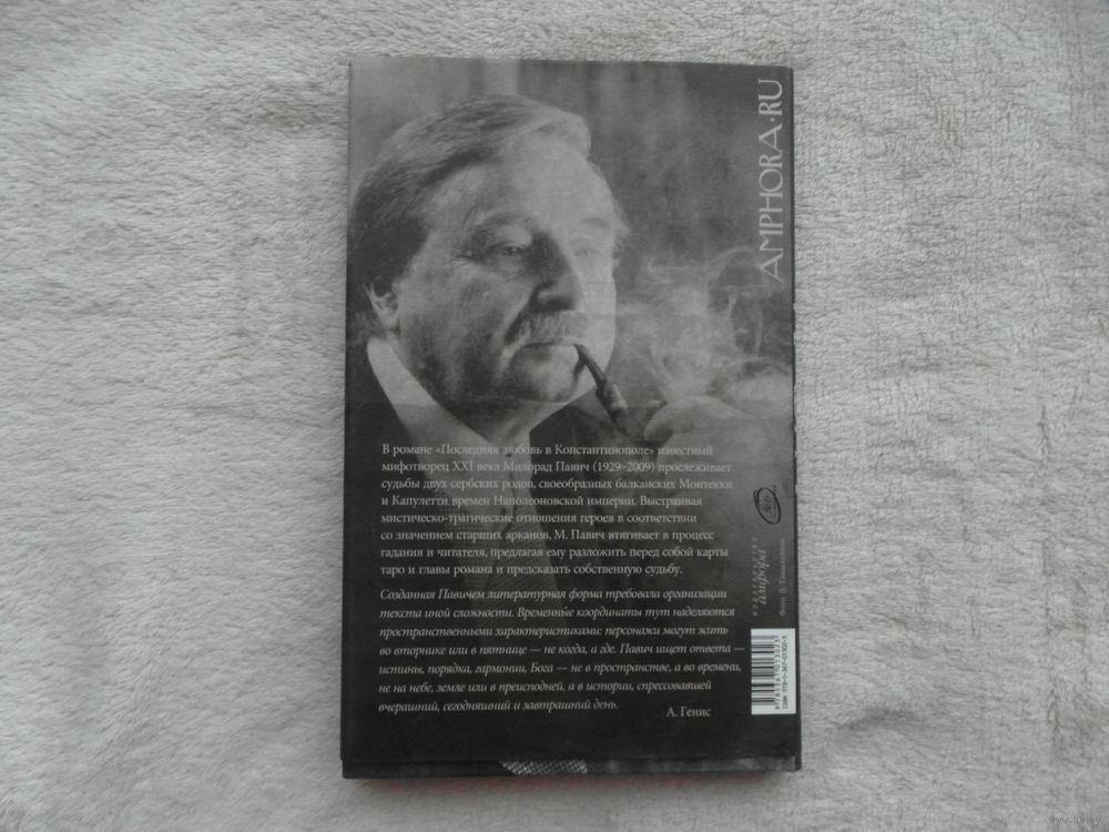 Книга всемирно известного писателя Милорада Павича (р. 1929) `Последняя любовь в Константинополе` была издана в Югославии, Греции, Великобритании и России. Это роман-игра, основанный на картах Таро. С Таро связаны не только названия глав, но и их последовательность: от того, как лягут карты, зависит движение сюжета и характер развязки.