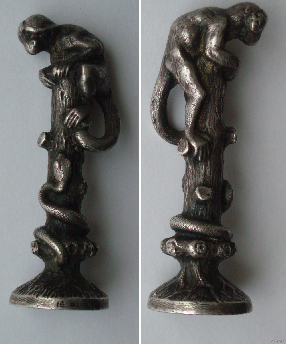 | Оригинальная печать, высота 57 мм. Бережное домашнее хранение. Серебро, патина. Обезьяна и змея ползёт по дереву | |