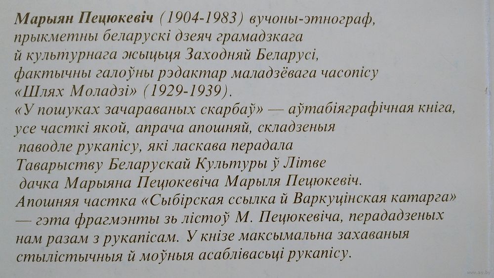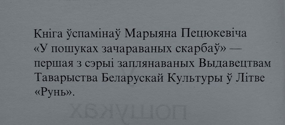 Пецюкевіч М. Я. У пошуках зачараваных скарбаў. Рэд. і аўт. паслясл. А.Мінкін. Вільня : Выд-ва Т-ва бел. культуры "Рунь", 1998 г. 181 с. Мяккая вокладка.