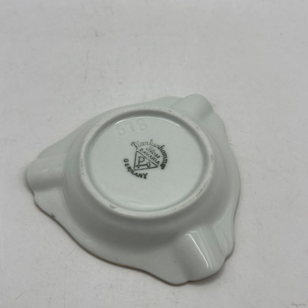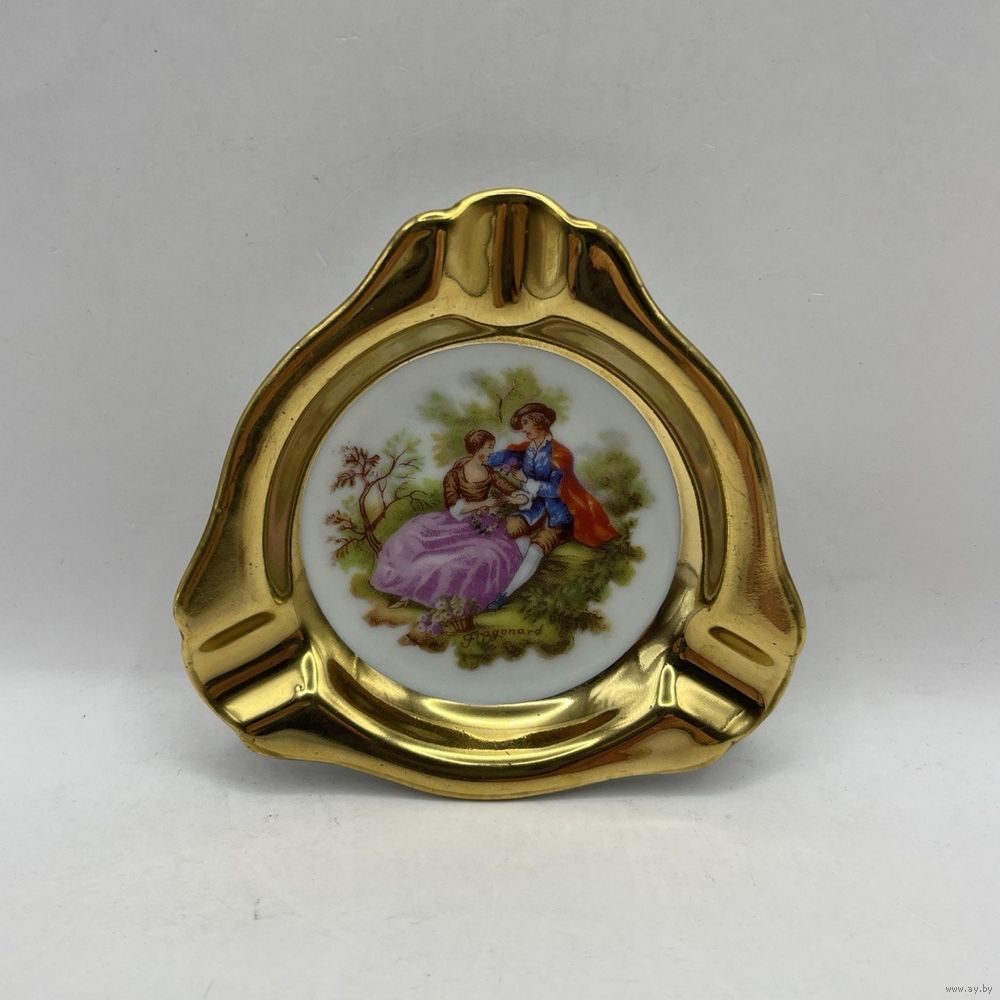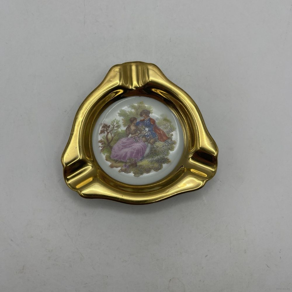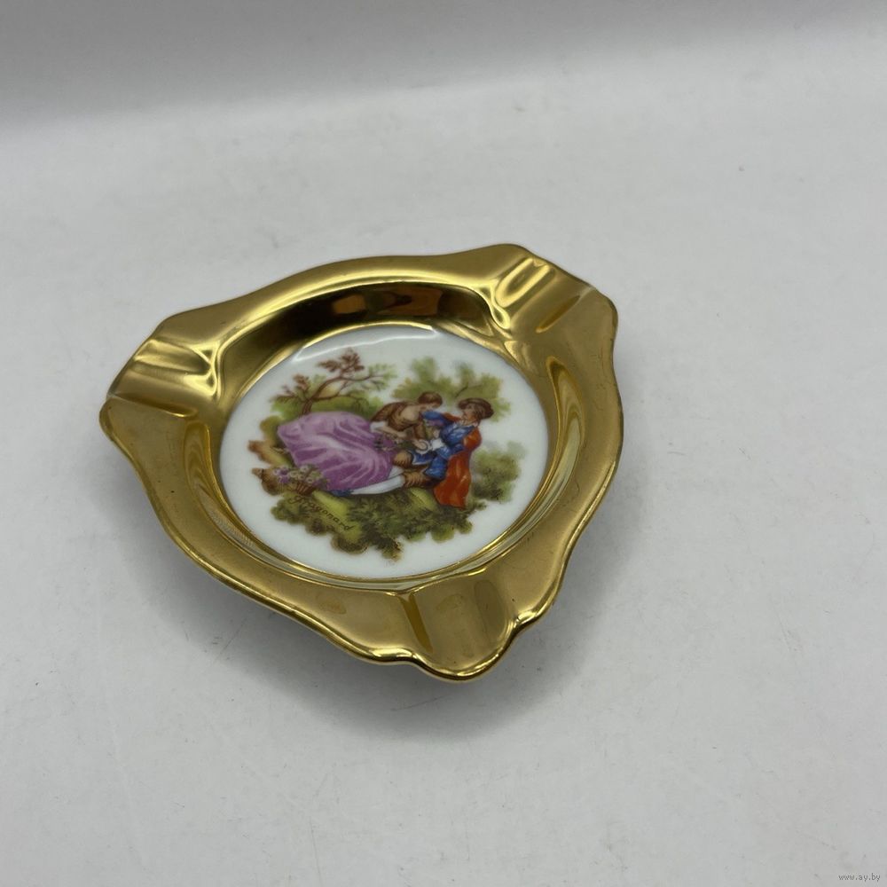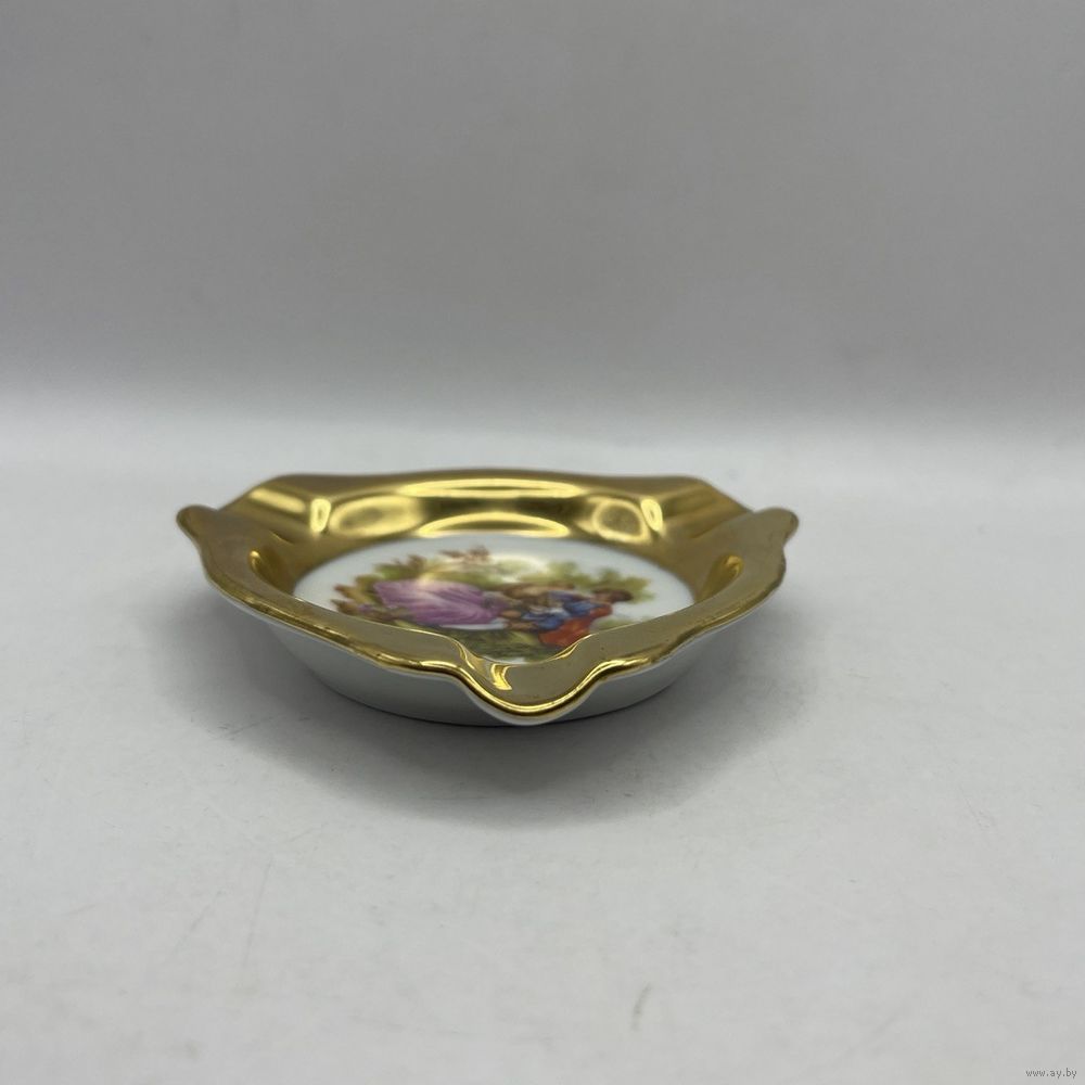Антикварная фарфоровая пепельница от мануфактуры Plankenhammer, декорирована романтическим сюжетом и ручным покрытием 23К золотом. Германия. Клеймо периода 1928-1945 г.г., номер в тесте. Размер 8,5 х 8,5 см.