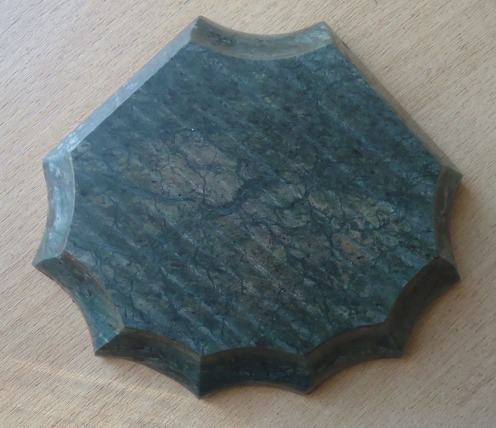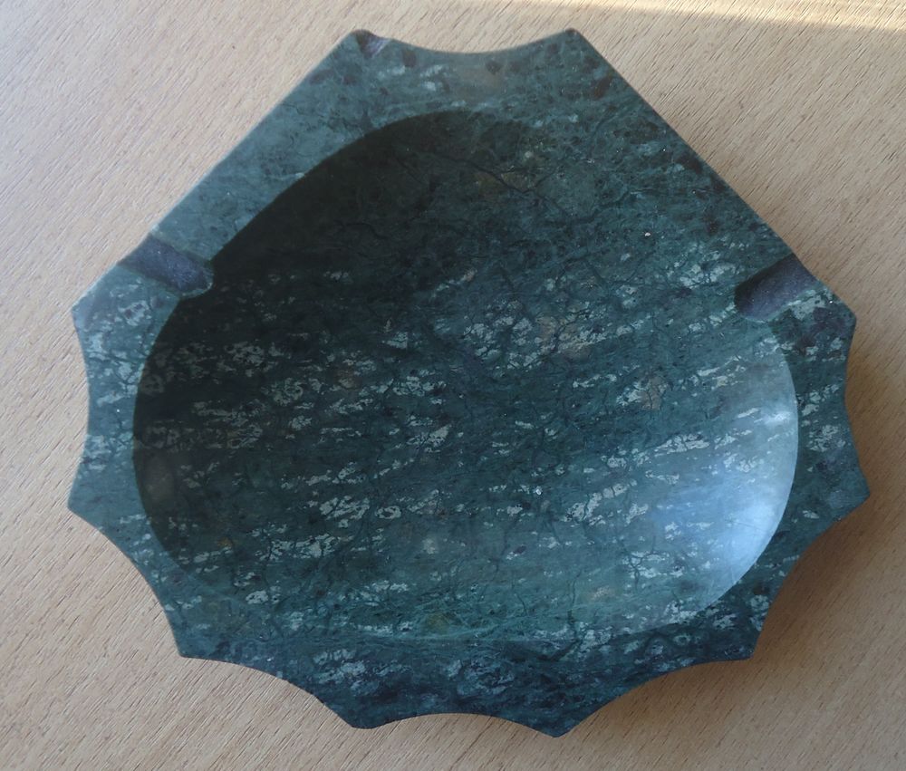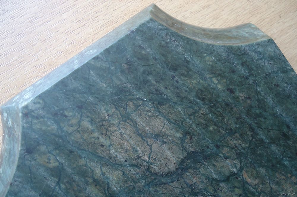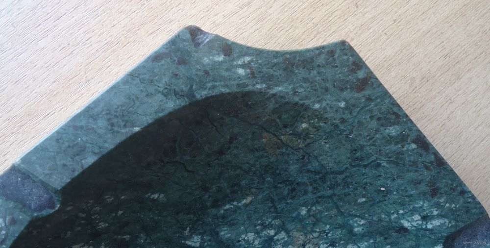 Камень зелёного цвета. Пепельница тяжёлая. На отдельных углах есть сколы, один скол значительный (фото).