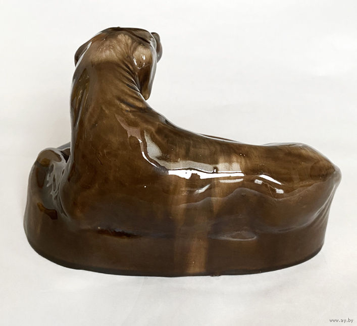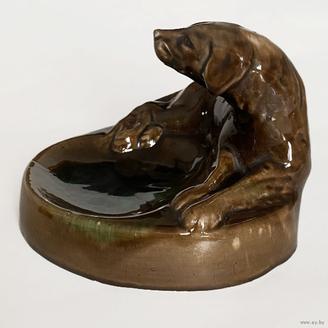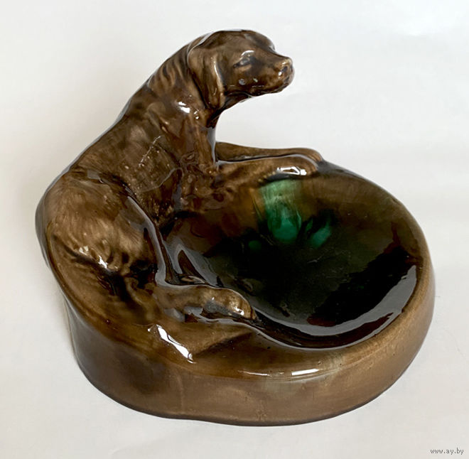 Керамическая статуэтка-пепельница "Охотничья Собака Сеттер". Обливная Керамика Майолика. Высота 12 см. Основание 18,8×16 см. Васильковский майоликовый завод, год выпуска 1955-1963 годы (по клейму), в отличном состоянии без сколов, трещин и следов использования.