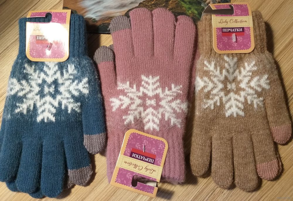 Перчатки с узором, новые-3пары, теплые, бежевые-синие-розовые, длина перчатки-21.5см, длина пальцев-5.5см, тянутся.