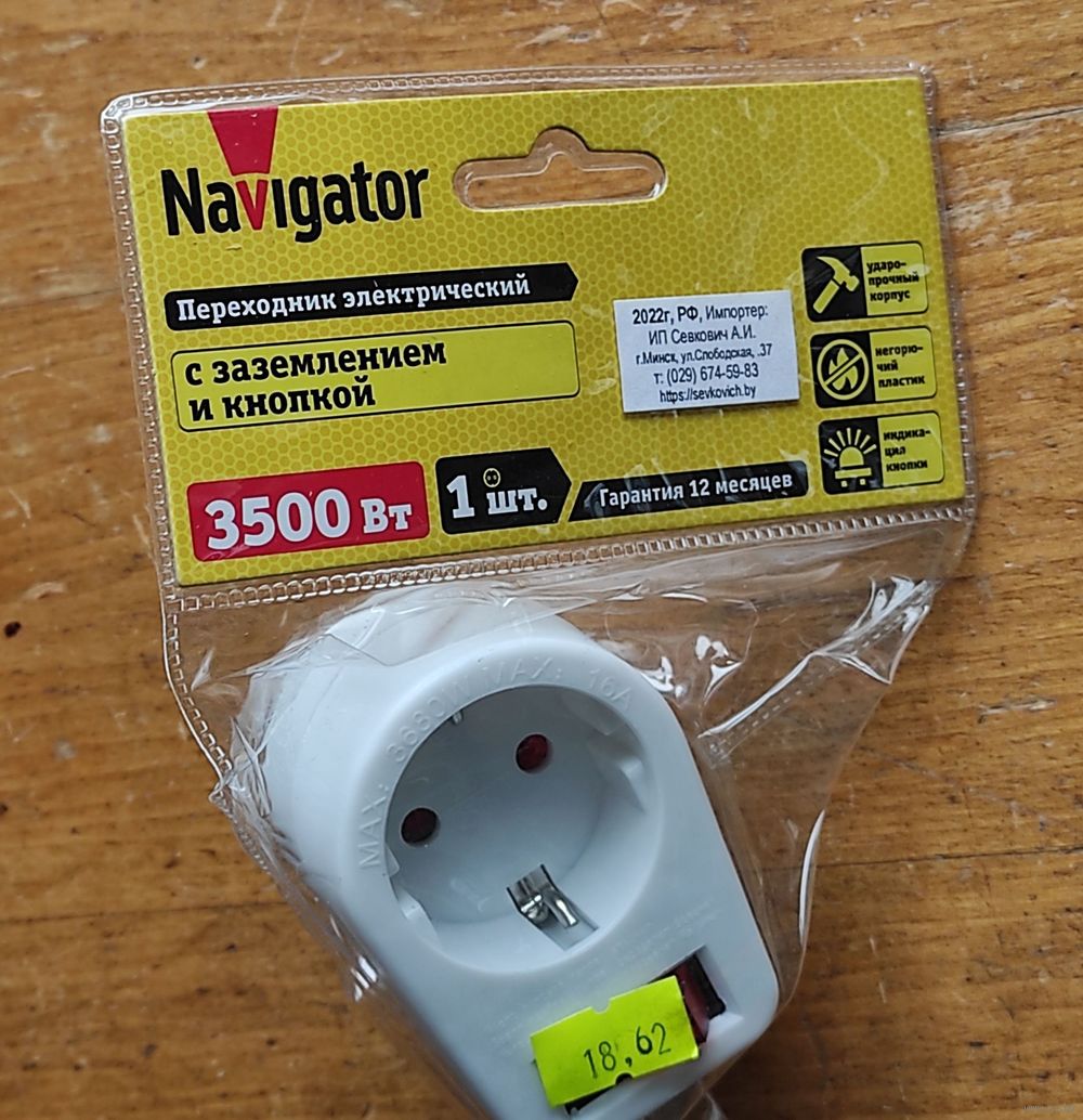 Переходник вилка-розетка 1гн. с выкл. Navigator NAD-1E 3500Вт
