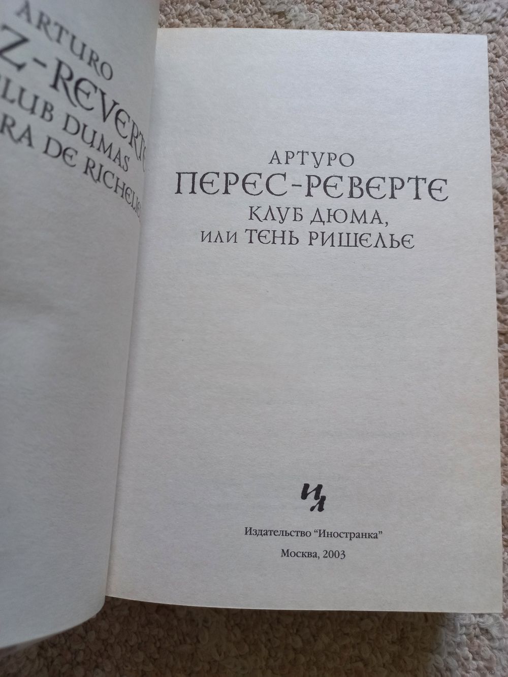 Перес-Реверте Артуро. Клуб Дюма,или Тень Ришелье. Серия: The Best of Иностранка. Пер. с испанского Н. Богомоловой. М. Иностранка. 2003г. 557с. Твердый переплет, уменьшенный формат.