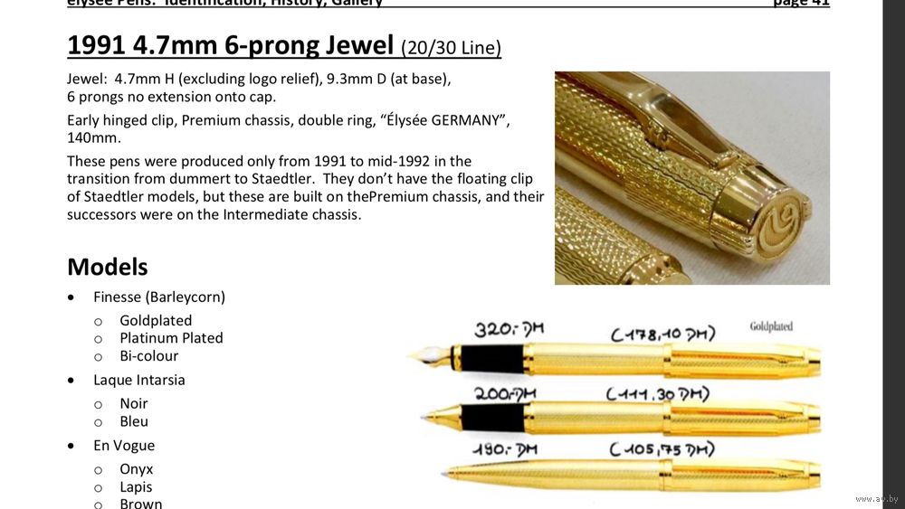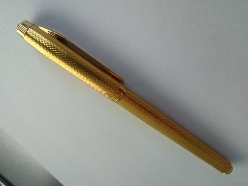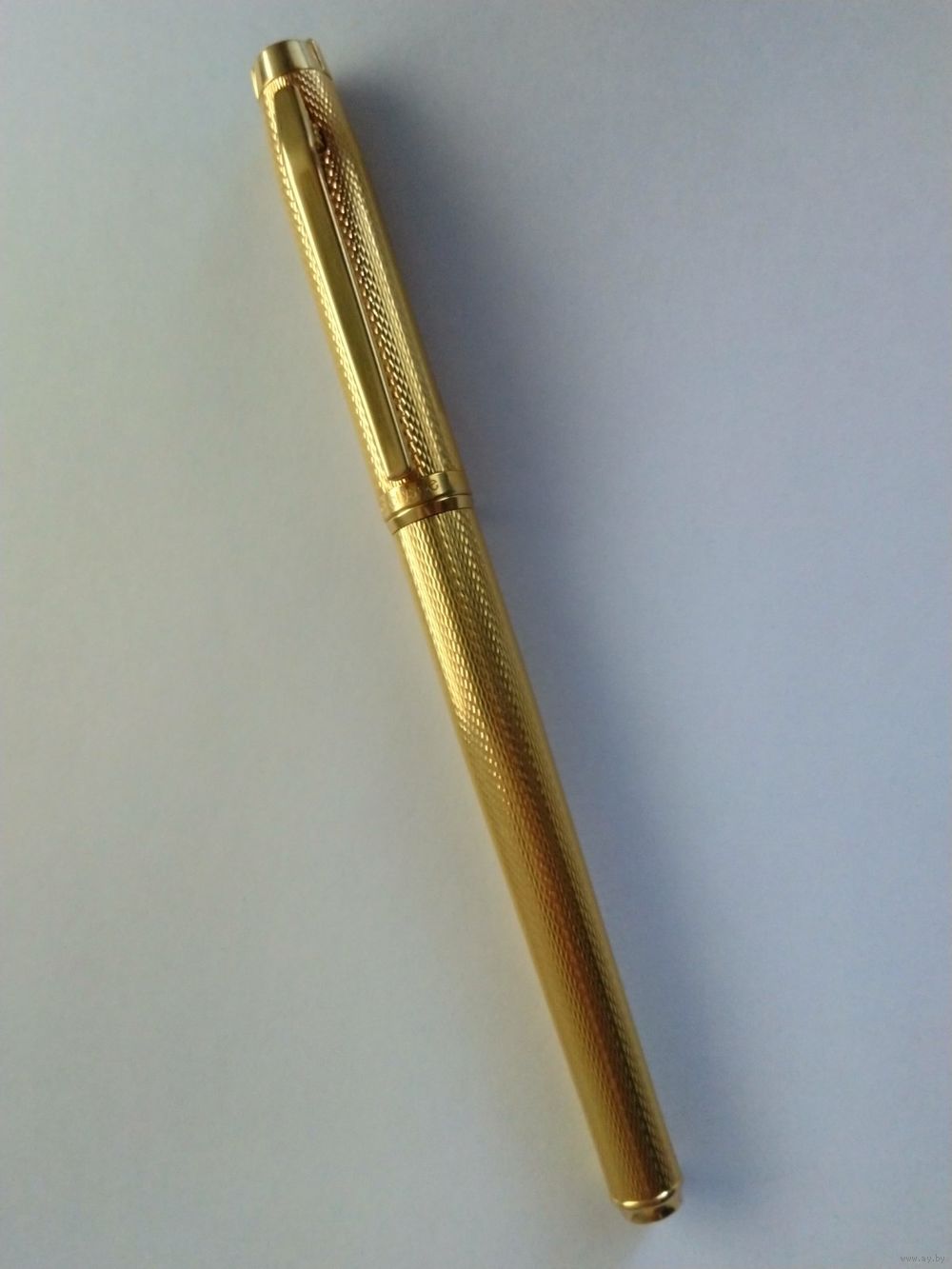 Предлагается красивая и редкая перьевая ручка Elysee, модель En Vogue Barleycorn Gold Plated известной немецкой, уже не существующей с 2000 года, фирмы. Перо золотое двухцветное 18к (750 проба), размер F (тонкая линия), пишет замечательно, очень мягко. Картриджно-конвертерная система заправки. Колпачек на защелке. На заднюю часть одевается тоже с щелчком. Клип с пружинным механизмом. Отличное состояние. Данная модель выпускалась меньше двух лет с 1991 по середину 1992 г. В комплекте только ручка с конвертером.