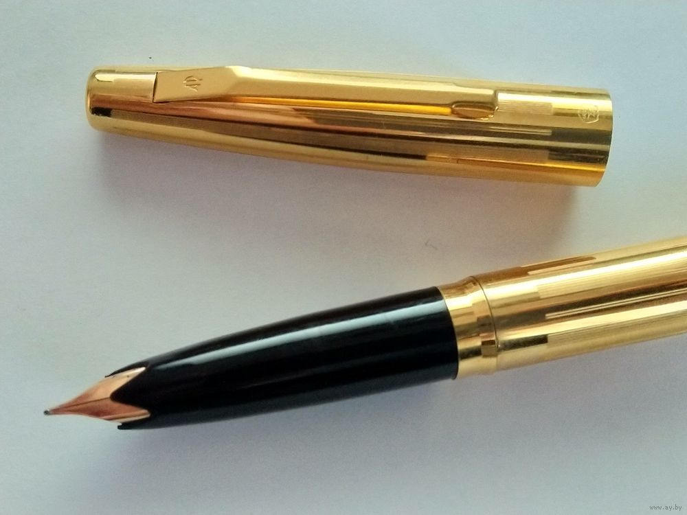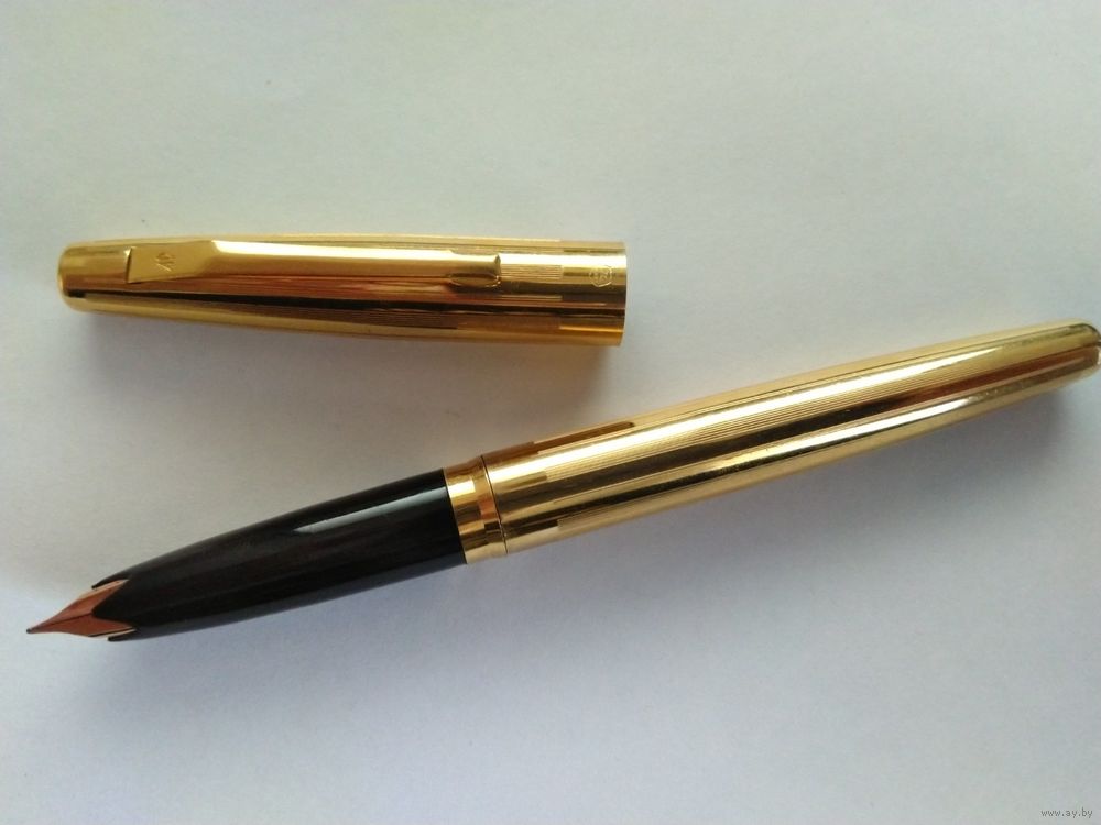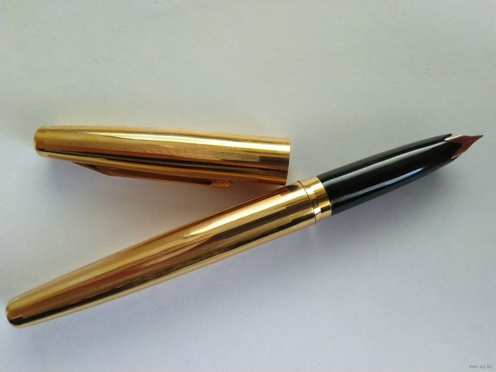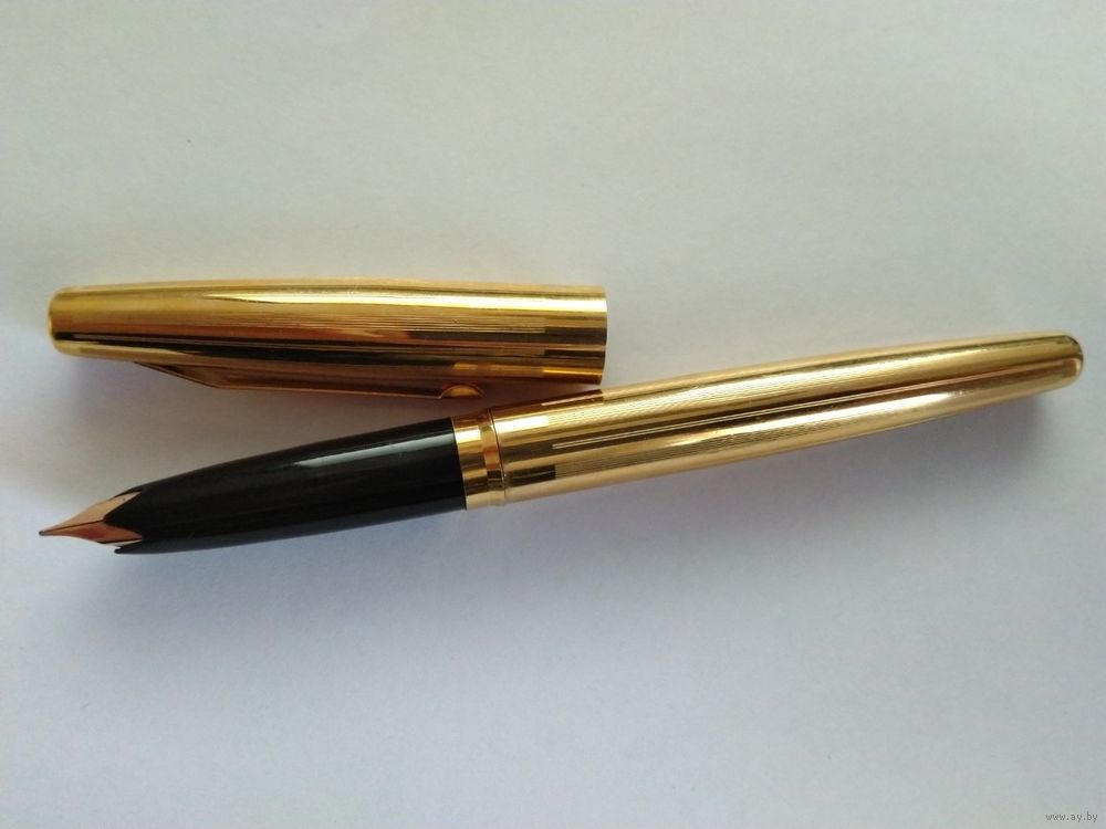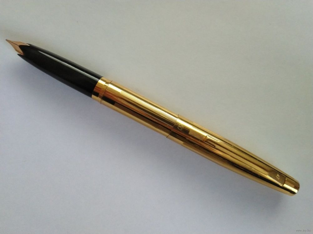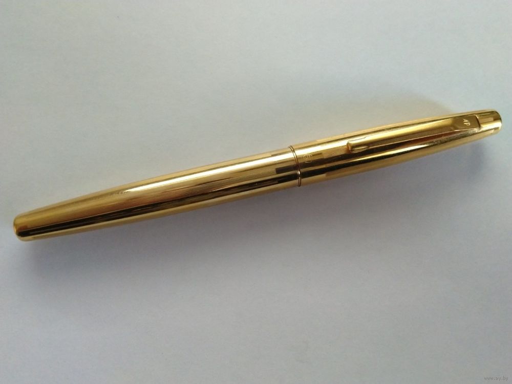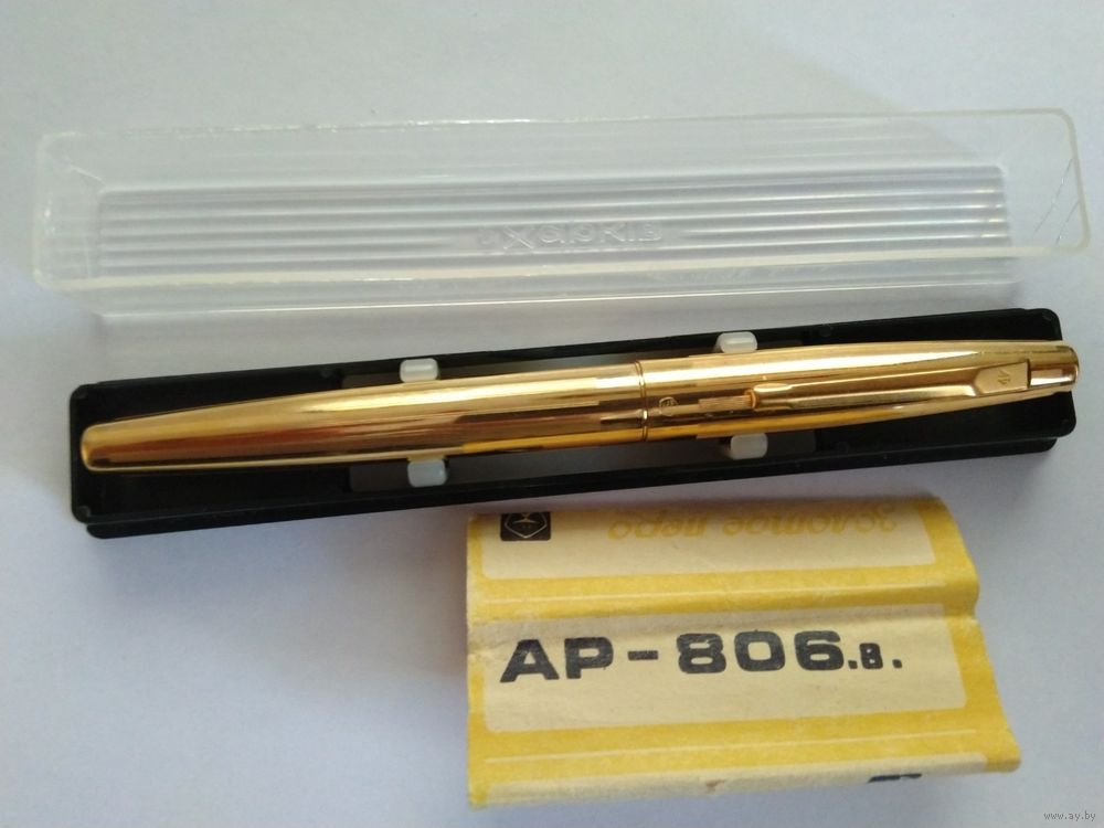 Харьковский завод "Оргтехника", модель АР-806.8. Позолоченный корпус, с продольными полосками гильоши. Ниже клипа колпачка, знак качества СССР. Система заправки встроенный конвертер. Перо золотое 583 пробы, ~"EF", пишет тонко. Фидер эбонитовый. Ручка в отличном состоянии, в эксплуатации не была.