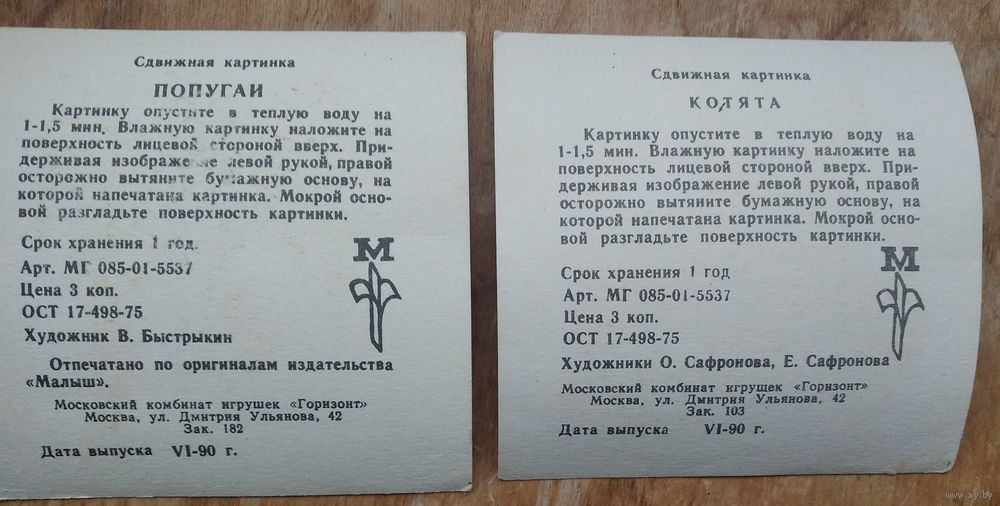 Переводные (сдвижные) картинки. Животные. 1990 г. Москва. 2 шт. Цена за 1.