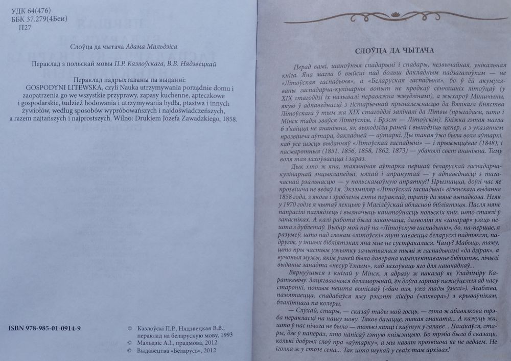 Вялікі фармат. Тыраж 1300 экз. 384 стар. Пер. з польс. П.Р. Казлоўскага, В.В. Нядзвецкай; прадмова А. Мальдзіса. Гэтая кніга — своеасаблівая энцыклапедыя і каштоўная крыніца звестак аб тым, як вялі гаспадарку беларускія жанчыны (беларусы аж да пачатку XX стагоддзя называліся літвінамі). Утрымлівае шмат надзвычай цікавых і карысных парадаў і рэкамендацый: як зберагчы ў належным стане дом, як захоўваць, сушыць, саліць, марынаваць гародніну і садавіну, як варыць варэнне, як улічваць даходы і расходы ў гаспадарцы, як засцерагчыся ад пажару, як заставацца прывабнай…