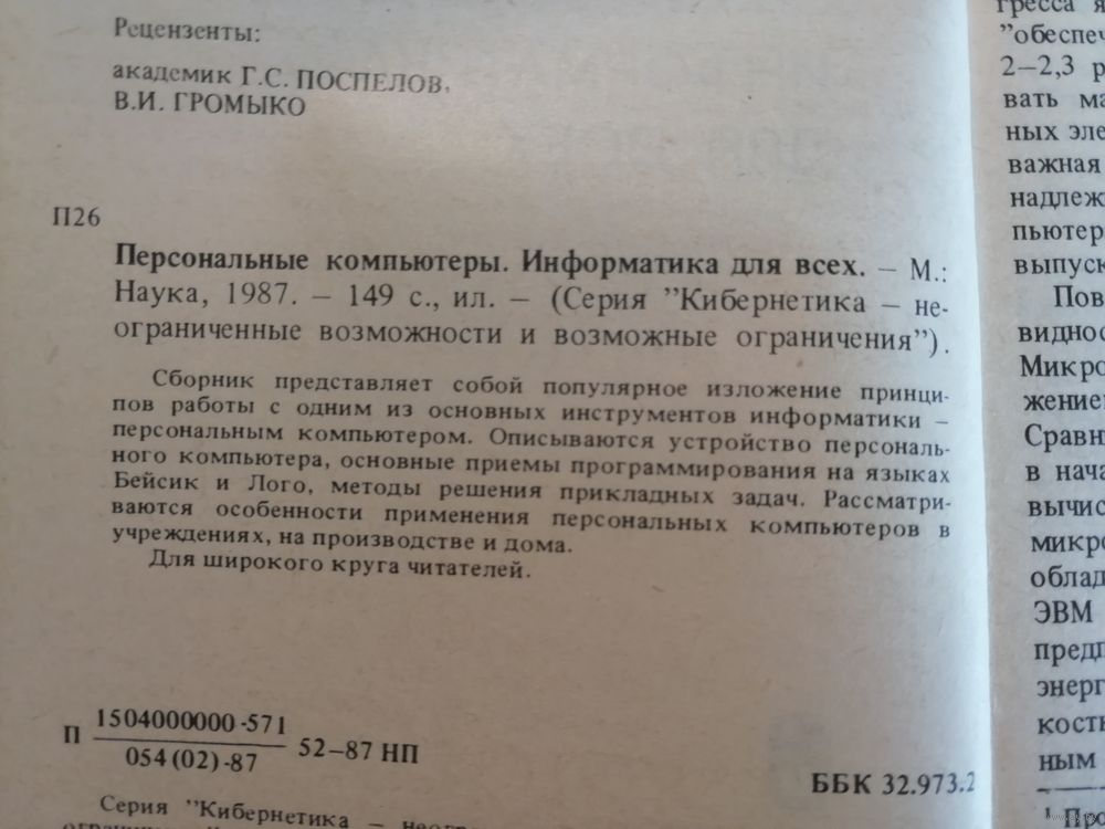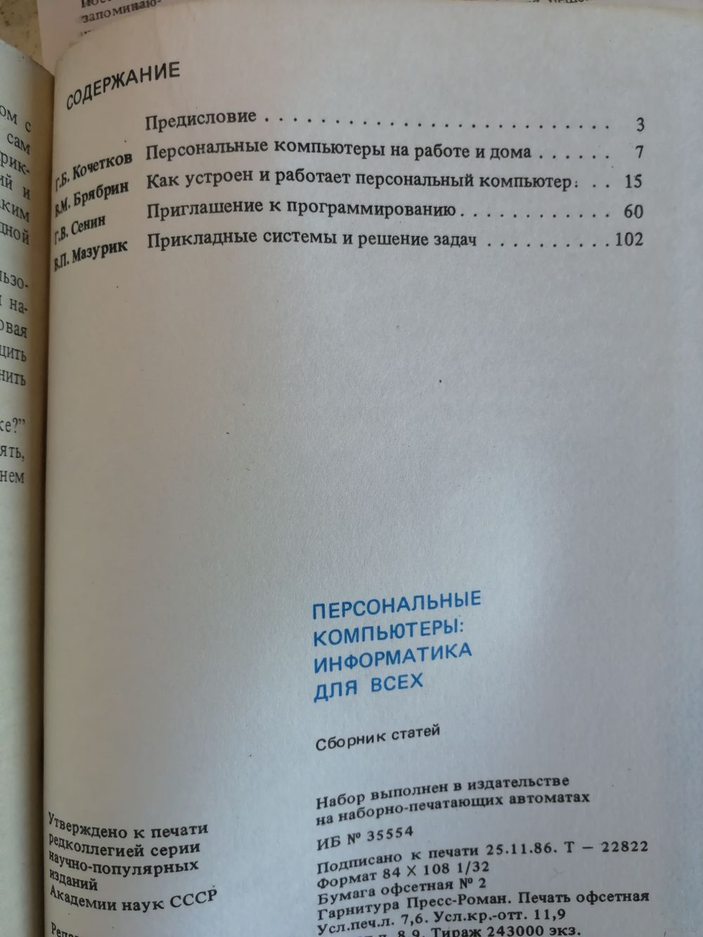 Сборник представляет собой популярное изложение принципов работы с одним из основных инструментов информатики - персональным компьютером. Описывается устройство персонального компьютера, основные приемы программирования на языках Бейсик и Лого, методы решения прикладных задач. Рассматриваются особенности применения персональных компьютеров в учреждениях, на производстве и дома.