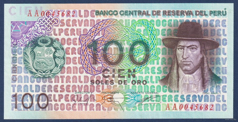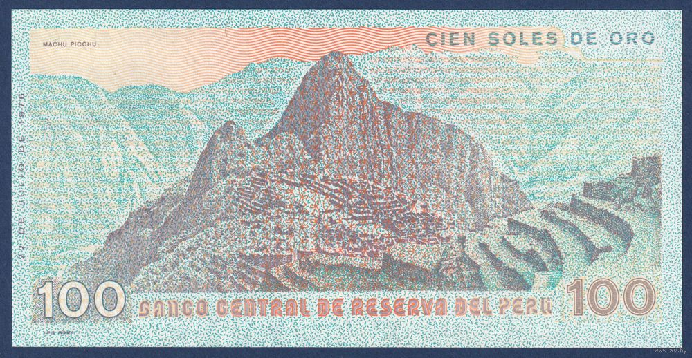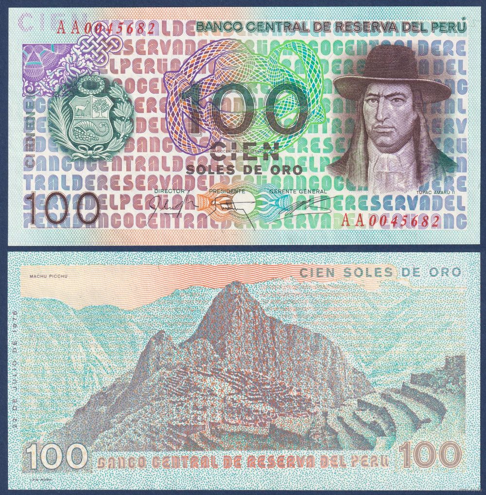 Перу, 100 солей золотом 1976 г., P-114 (AA, революционер Тупак Амару II, древний город Мачу-Пикчу), UNC
