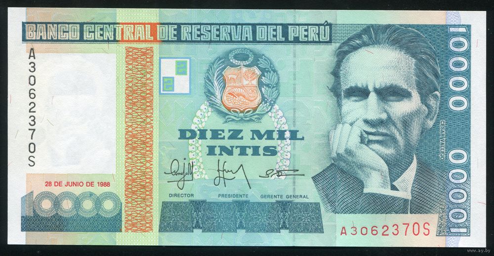 Перу 10000 инти 1988 г. Серия A. P140. UNC