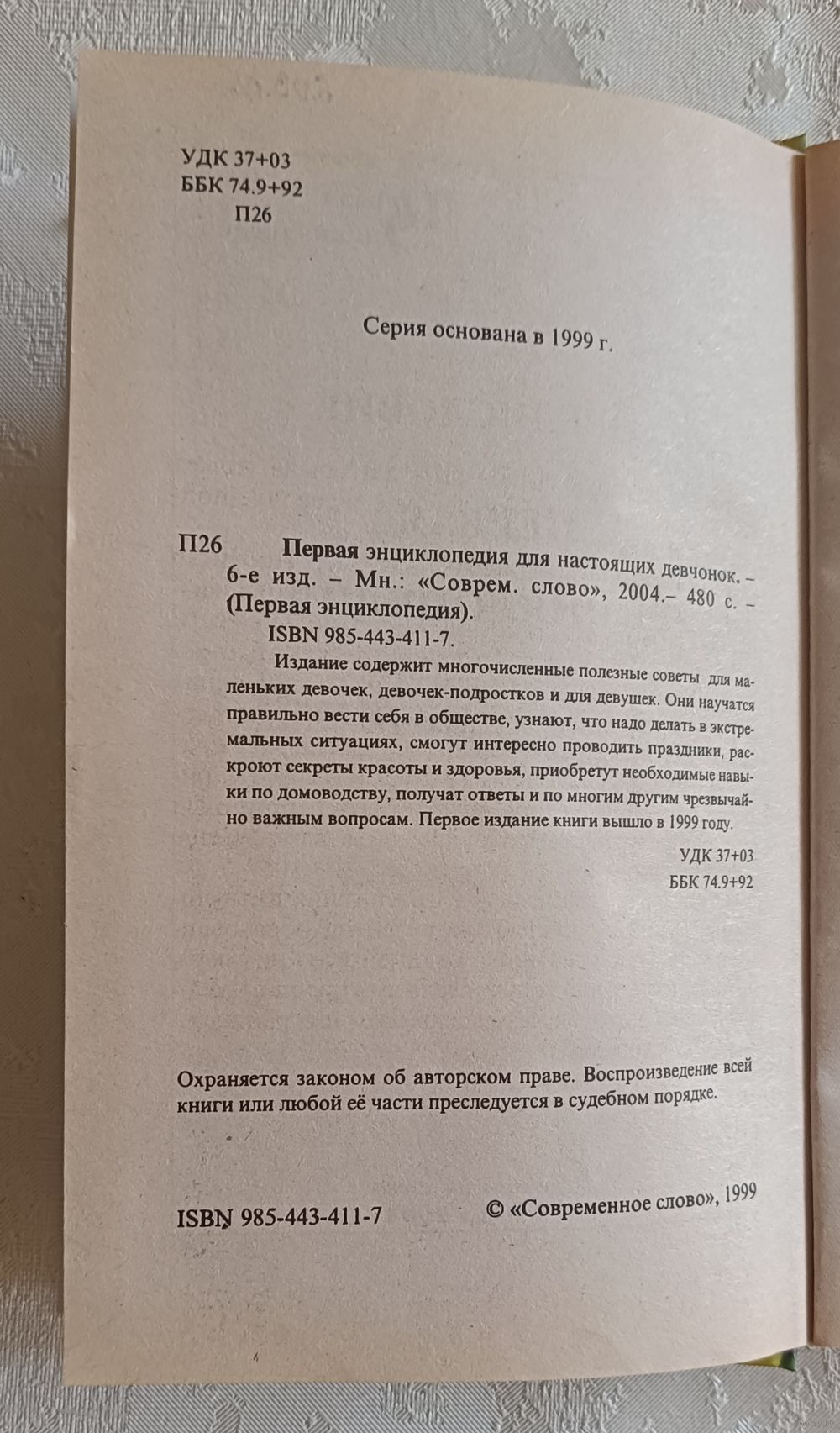 Первая энциклопедия для настоящих девчонок. -6-е изд. Мн.: «Соврем. слово», 2004.- 480 с. -(Первая энциклопедия), твердый переплет, обычный формат.