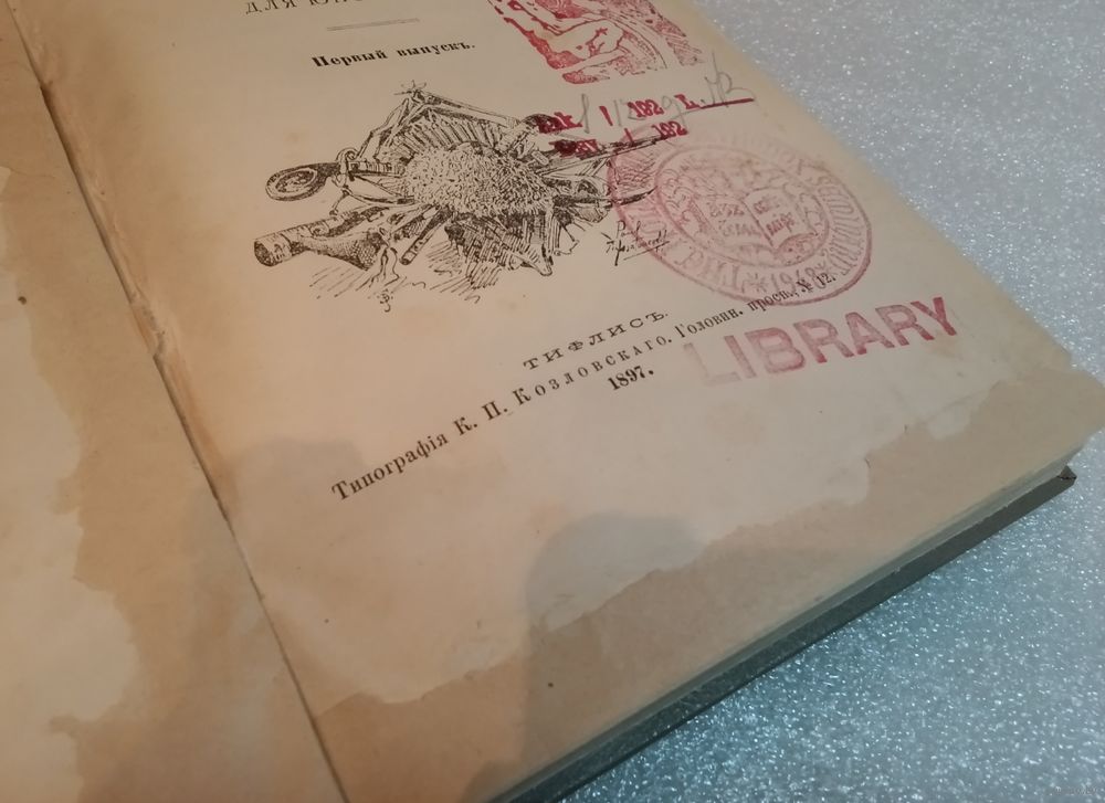 Сохранность хорошая, листы все, переплет с золотым тиснением, есть сквозное пятно на переплете, небольшое, текст не затронут. Без посторонних запахов.