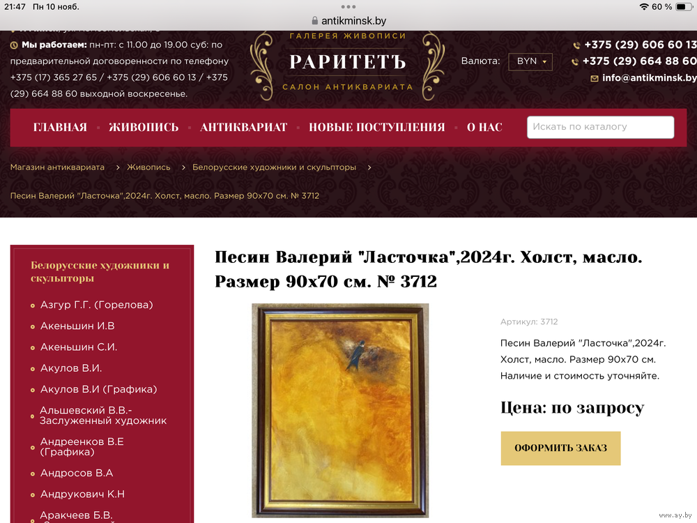 Картины находятся в собраниях Национального Художественного Музея в Минске и Национального центра современных искусств (Беларусь), в частных коллекциях, в том числе в коллекции Михаила Алшибая. — NATURO, ARTIS GALLERY, ЦСИ Винзавод Москва (2020); — H2O, ЦСИ Винзавод (2018); — Персональная выставка, СДМБанк, Москва (2018); — Персональная выставка, галерея «А3», Москва (2011); — Персональная выставка, галерея «АртЯр», Москва (2009); — Персональная выставка, музей города Лемборк, Польша (2011); — Персональная выставка, музей города Эйндховен, Нидерланды (1996); — Персональная выставка, галерея «Arte Directo», Гранада, Испания (1995); — Персональная выставка, галерея «Im Hof», Эссен, Германия (1994).