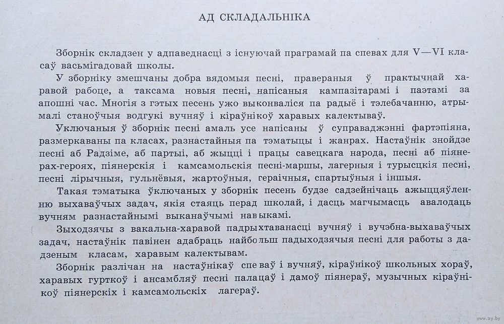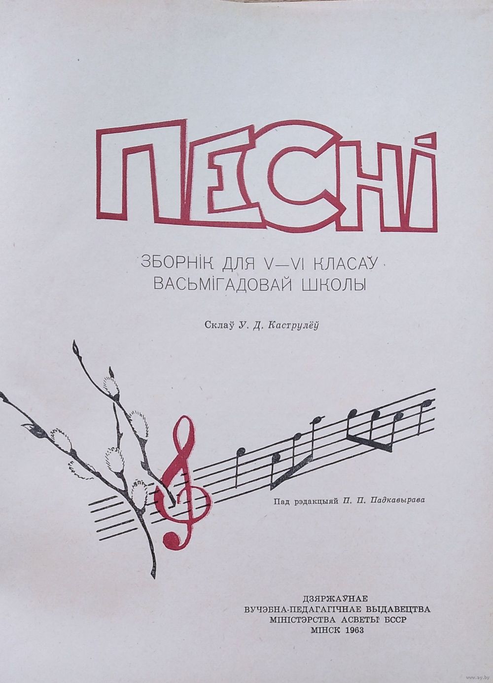 Песні : Зборнік для 5-6 класаў васьмігадовай школы: Для спеваў (соло, хор) у суправаджэнні ф.-п. і без суправаджэння. Склаў У. Д. Каструлёў. Мінск : Народна асвета, 1963 г. 264 с. Цверды пераплет. Энцыклапедычны фармат.