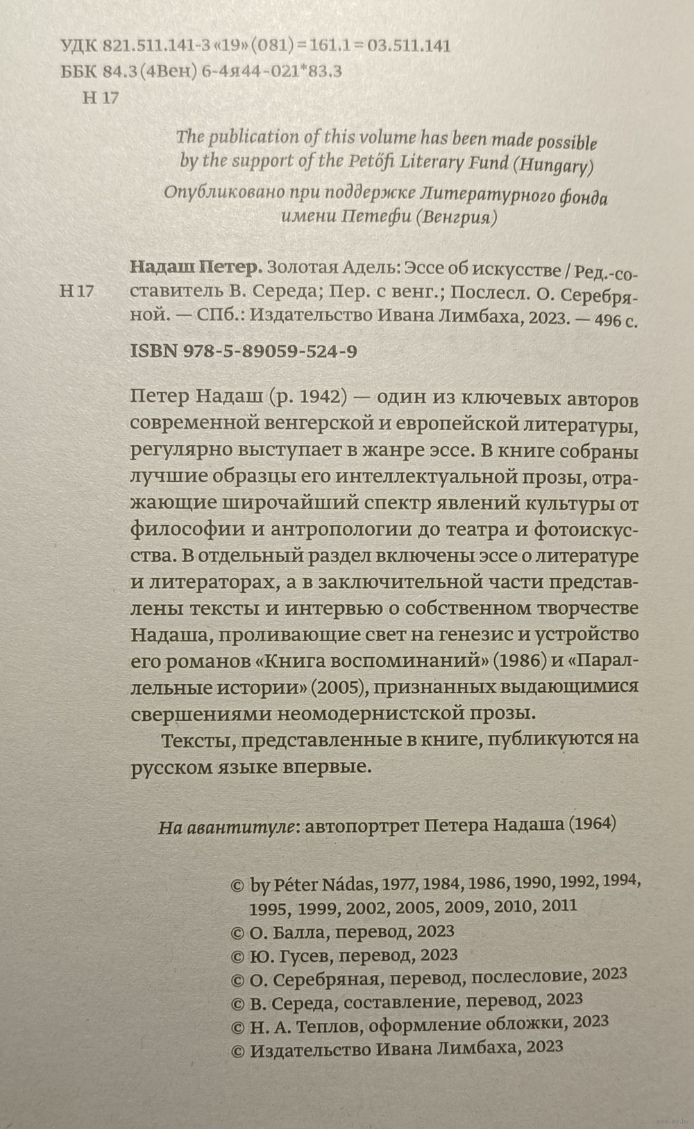 Петер Надаш – один из ключевых авторов современной венгерской и европейской литературы, регулярно выступает в жанре эссе. В книге собраны лучшие образцы его интеллектуальной прозы, отражающие широчайший спектр явлений культуры от философии и антропологии до театра и фотоискусства. В отдельный раздел включены эссе о литературе и литераторах, а в заключительной части представлены тексты и интервью о собственном творчестве Надаша, проливающие свет на генезис и устройство его романов "Книга воспоминаний" (1986) и "Параллельные истории" (2005), признанных выдающимися свершениями неомодернистской прозы.