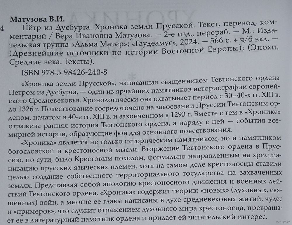Петр из Дусбурга. Хроника земли Прусской. Текст, перевод, комментарий 2-е изд., перераб. Серия: Эпохи. Средние века. Тексты М Альма-матер 2024г. 566с. Твердый переплет, Чуть увеличенный формат.