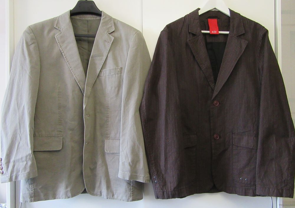 3) Синий первый пиджак ширина плеч 47 см, длина спины 75 см, длина рукава 66 см, ширина между подмышки 60 см.