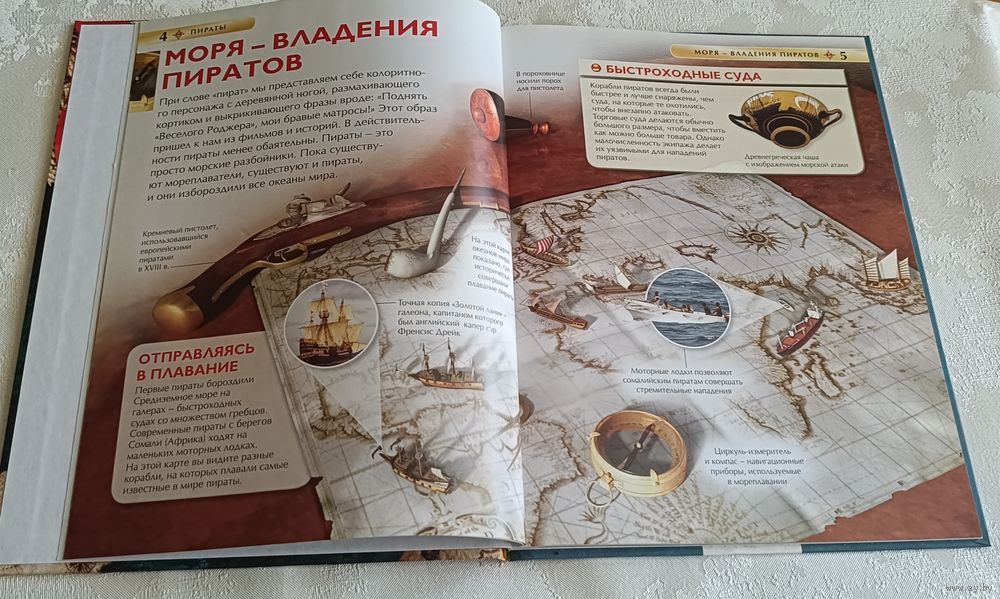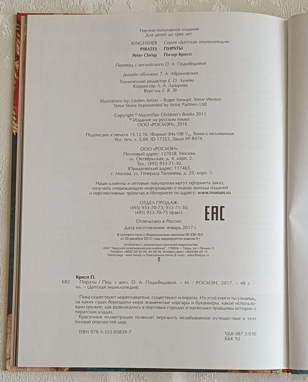 Пираты. Крисп Питер. М.: РОСМЭН, 2017. 48 с.: ил. (Детская энциклопедия)., твёрдый переплёт, увеличенный формат, мелованная бумага.