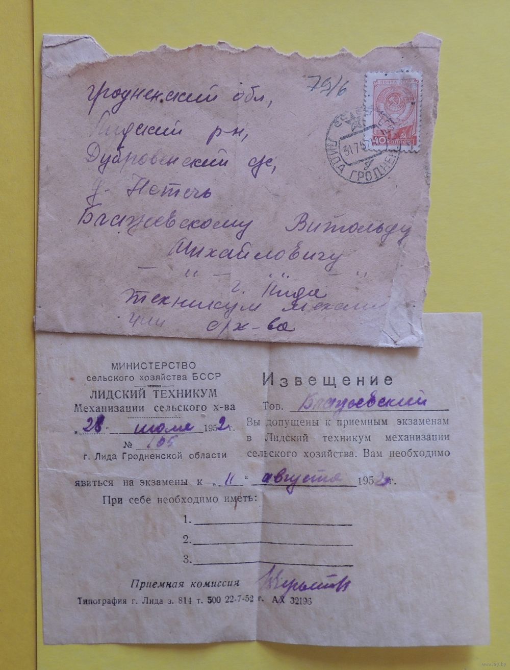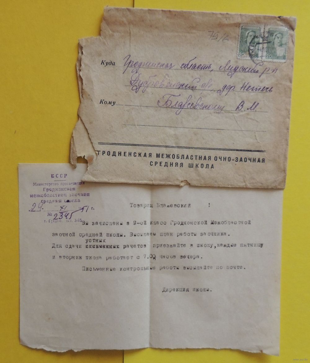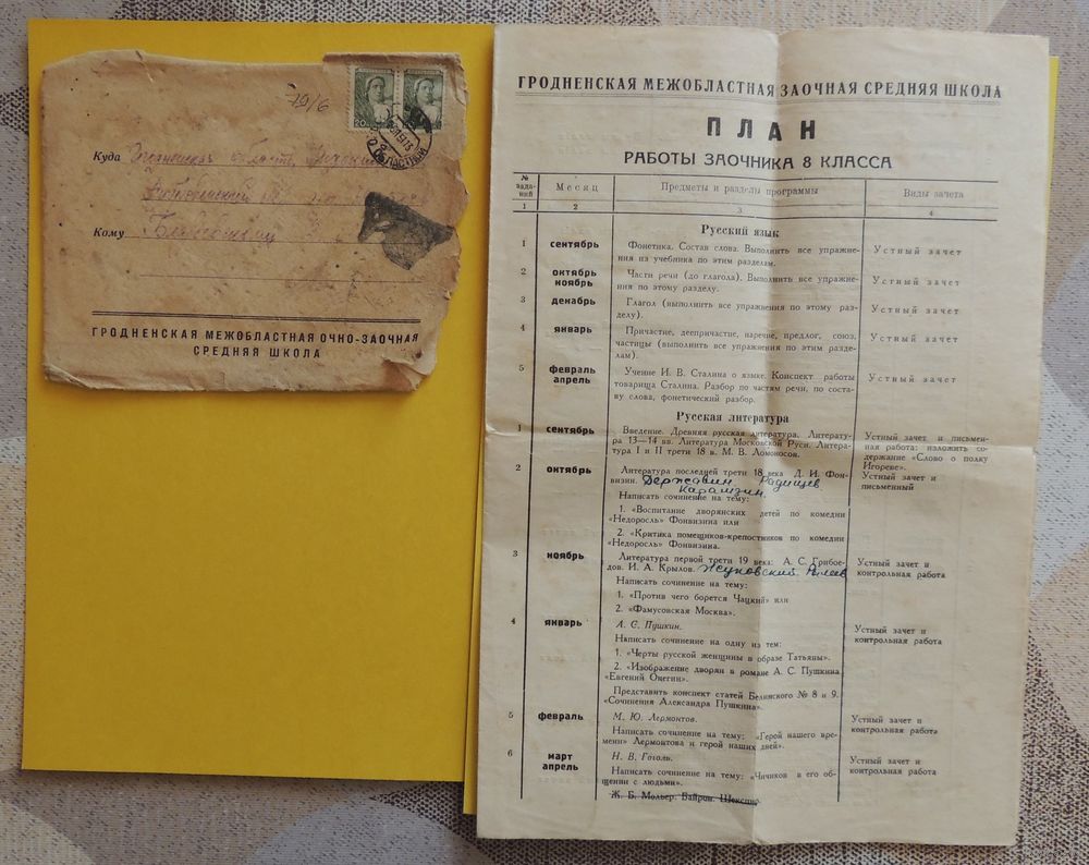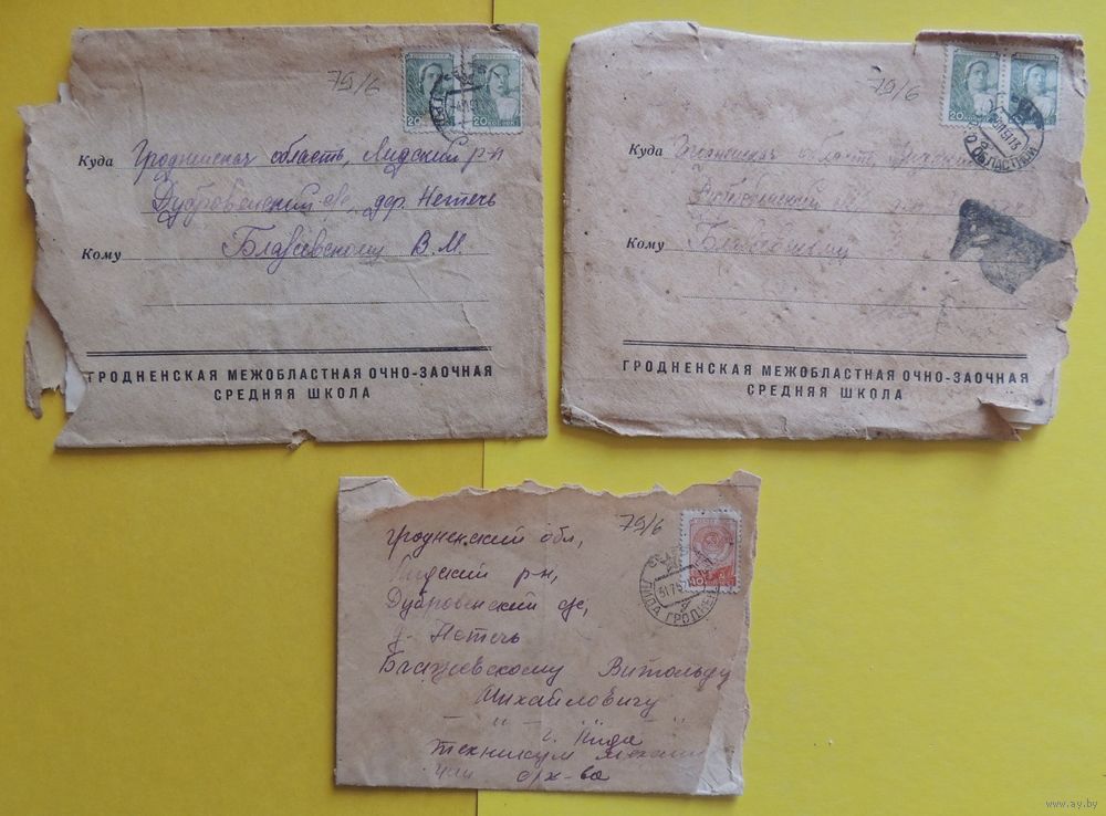 Письма и уведемления Гродненской межобластной заочной средней школы, 1951, 1952 гг., 3 шт.
