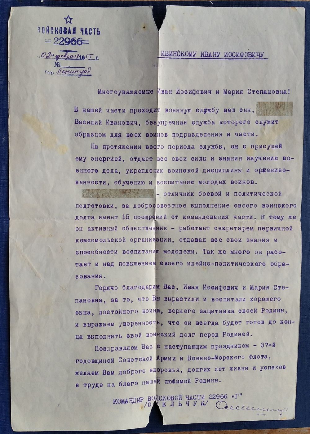 Письмо из воинской части с благодарностью родителям солдата. 1955 г