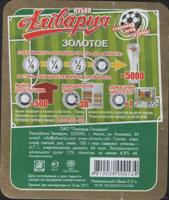 Пивная этикетка - Кубок Аливария