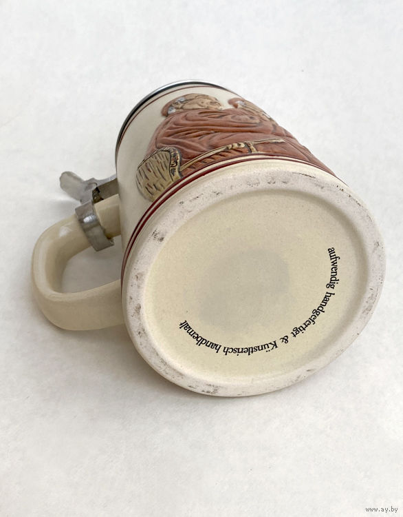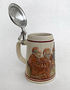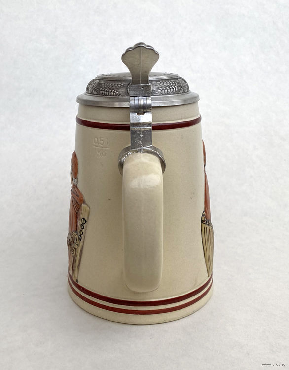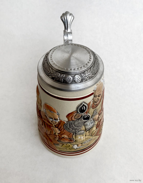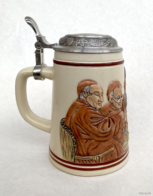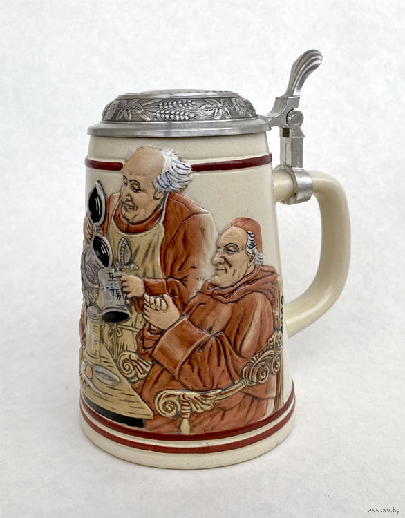 Пивная кружка "Весёлые монахи". Рельефная керамика, роспись, олово. Германия, 1990-2010 гг.