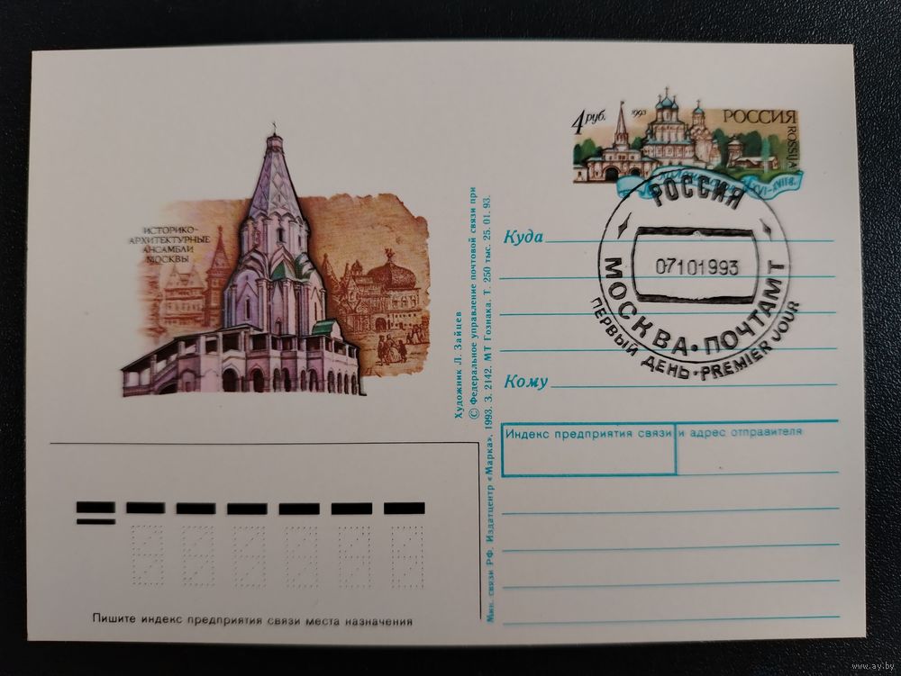 ПК Россия 1993 с ОМ спецгашением Историко-архитектурные ансамбли Москвы