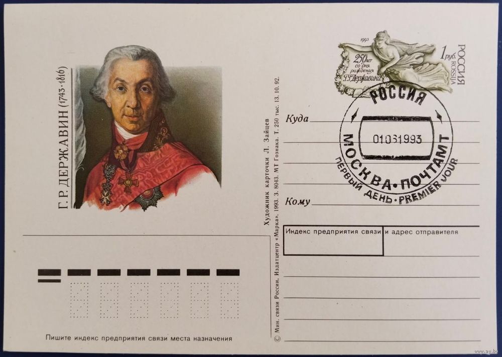 ПК с ОМ. Г.Р.Державин. Спецгашение. Россия. 1993 г.