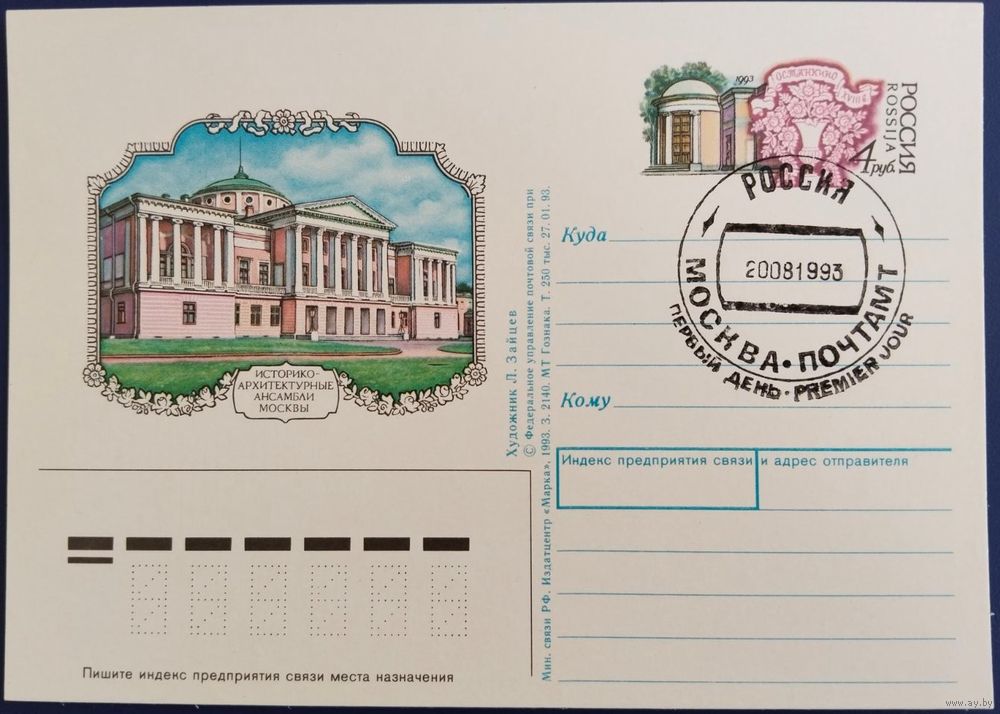ПК с ОМ. Историко-архитектурные ансамбли Москвы. Спецгашение. Россия. 1993 г.