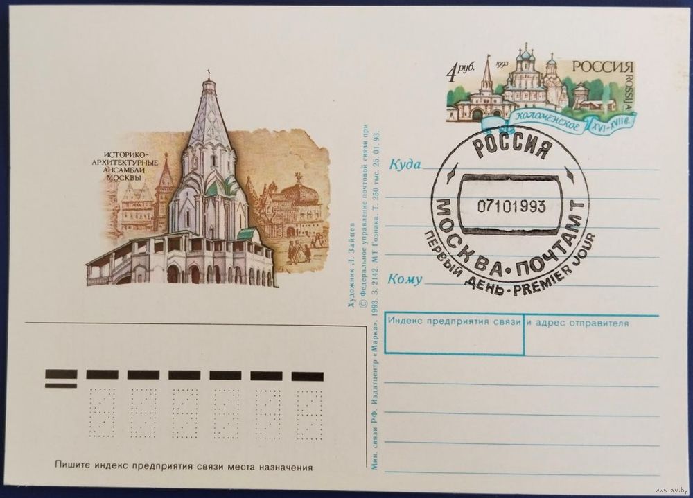 ПК с ОМ. Историко-архитектурные ансамбли Москвы. Спецгашение. Россия. 1993 г.