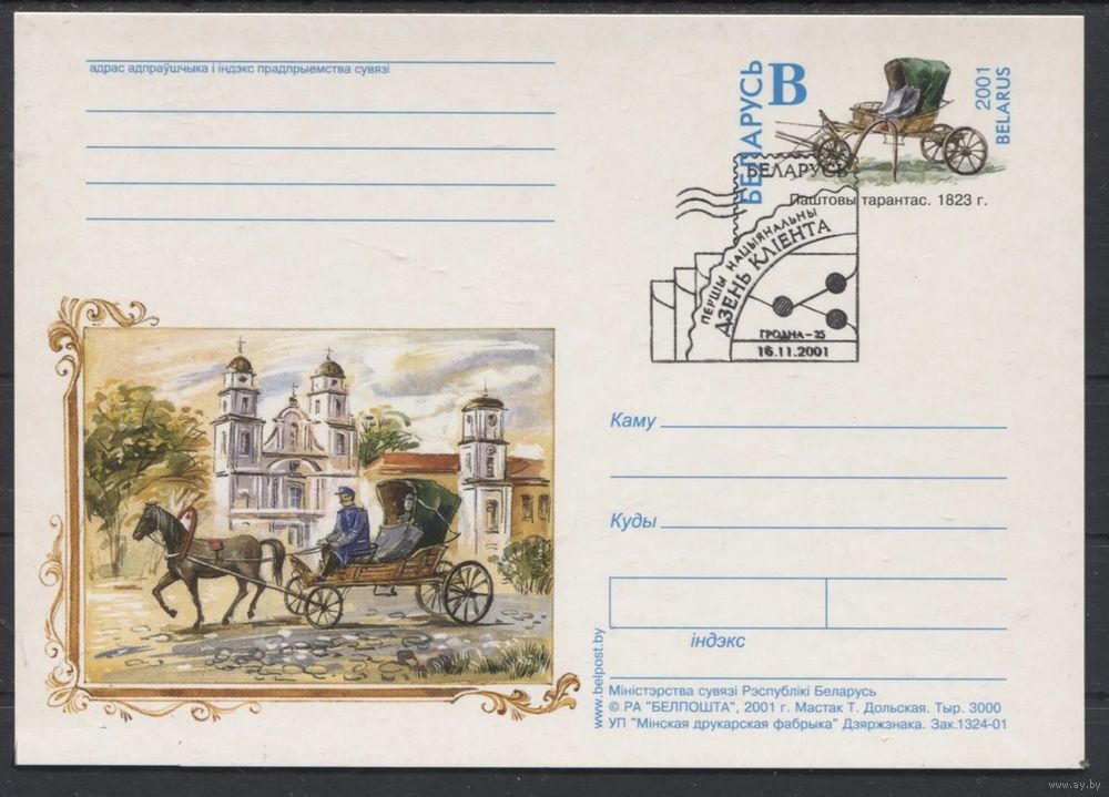 ПК с ОМ. Почтовый тарантас. Спецгашение Гродно. День клиента. Беларусь 2001 год.