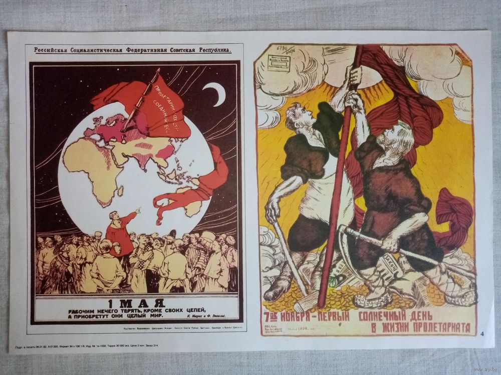 Плакат #4 1 Мая. Рабочим нечего терять, кроме своих цепей, а приобретут они целый мир. 7-ое ноября - первый солнечный день в жизни пролетариата. 1982 г СССР 40х27 см