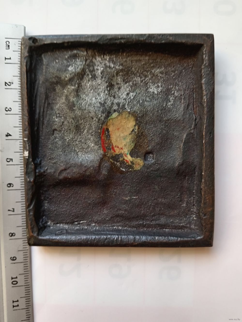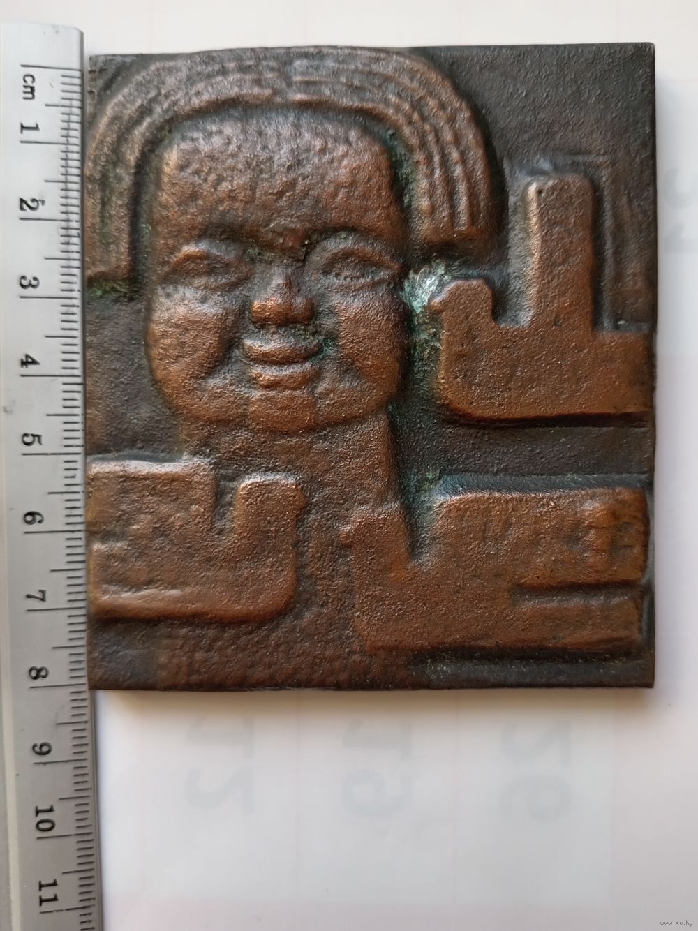 Лицо ребёнка в окружении голубей. Тяжёлая, из бронзы или меди, методом литья.