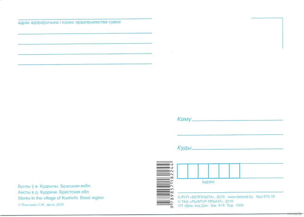 Планета Беларусь, Аисты в деревне Кудричи, 2019, тираж 1000. Передача в Витебске возле ратуши. Пересылка в другой город за счёт покупателя по тарифам Белпочты либо Европочты после 100% предоплаты.